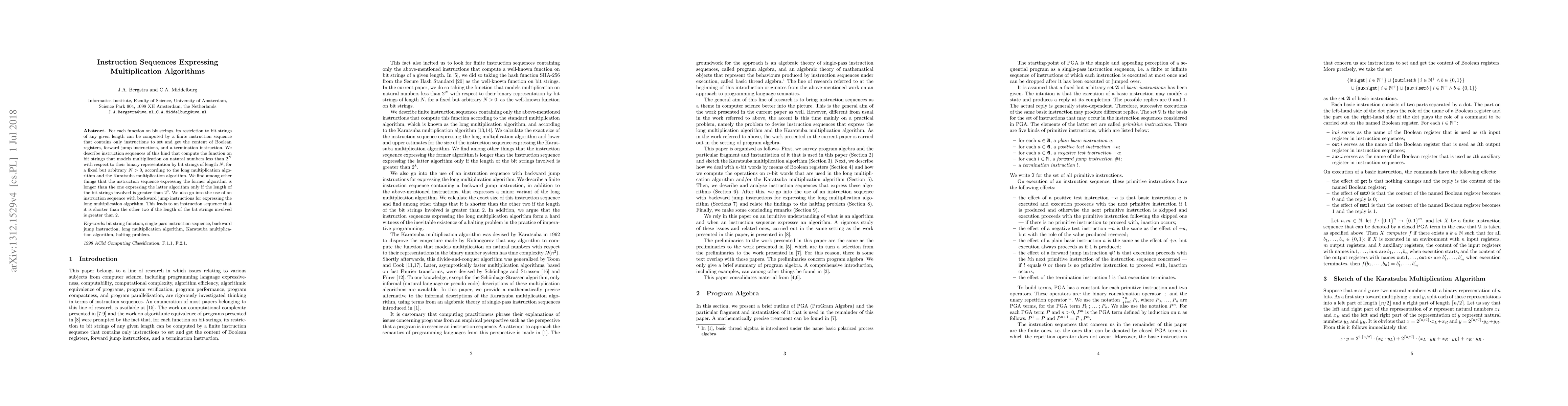 For each function on bit strings, its restriction to bit strings of any given length can be computed by a finite instruction sequence that contains only instructions to set and get the content of Boolean registers, forward jump instructions, and a termination instruction. We describe instruction sequences of this kind that compute the function on bit strings that models multiplication on natural numbers less than $2^N$ with respect to their binary representation by bit strings of length $N$, for a fixed but arbitrary $N > 0$, according to the long multiplication algorithm and the Karatsuba multiplication algorithm. We find among other things that the instruction sequence expressing the former algorithm is longer than the one expressing the latter algorithm only if the length of the bit strings involved is greater than $2^8$. We also go into the use of an instruction sequence with backward jump instructions for expressing the long multiplication algorithm. This leads to an instruction sequence that it is shorter than the other two if the length of the bit strings involved is greater than $2$.