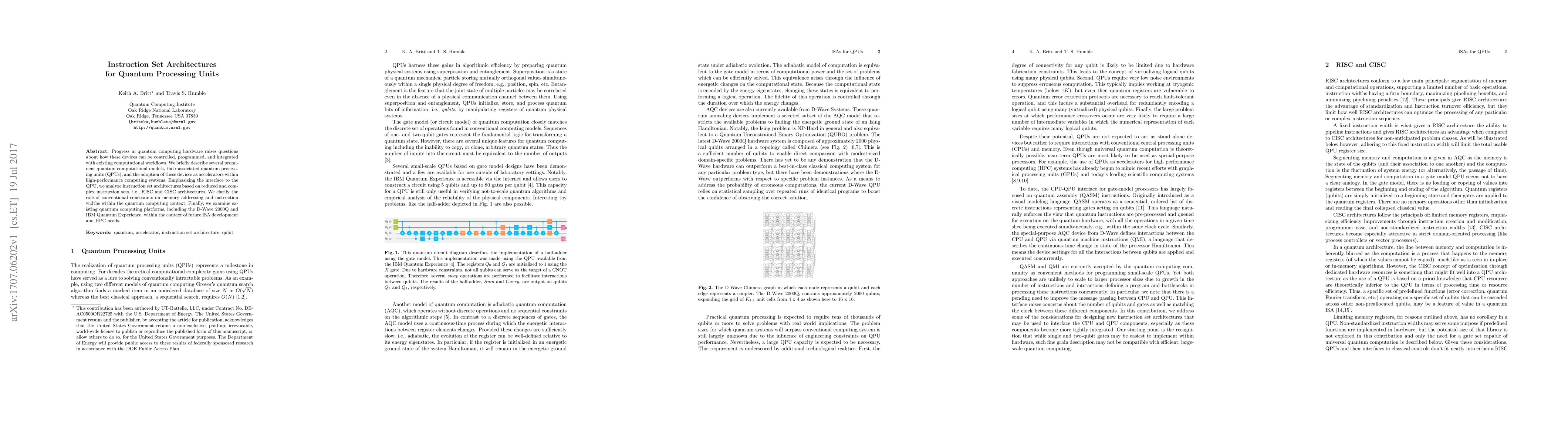 Progress in quantum computing hardware raises questions about how these devices can be controlled, programmed, and integrated with existing computational workflows. We briefly describe several prominent quantum computational models, their associated quantum processing units (QPUs), and the adoption of these devices as accelerators within high-performance computing systems. Emphasizing the interface to the QPU, we analyze instruction set architectures based on reduced and complex instruction sets, i.e., RISC and CISC architectures. We clarify the role of conventional constraints on memory addressing and instruction widths within the quantum computing context. Finally, we examine existing quantum computing platforms, including the D-Wave 2000Q and IBM Quantum Experience, within the context of future ISA development and HPC needs.