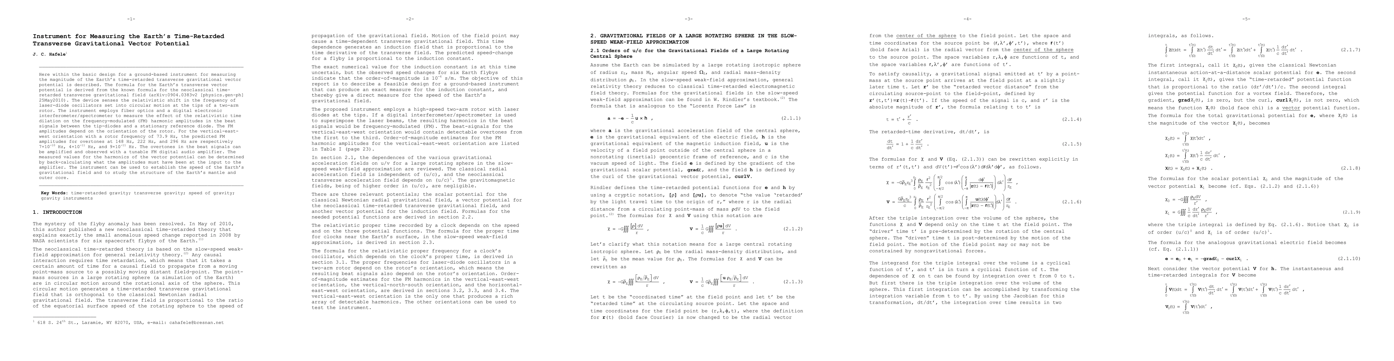This paper describes a ground-based instrument designed to measure the Earth's time-retarded transverse gravitational vector potential by detecting the relativistic frequency shift in laser-diode oscillators on a rotating two-arm rotor. The device uses fiber optics and digital electronics to analyze the frequency-modulated harmonic amplitudes in the beat signals, which can reveal insights into the Earth's gravitational field speed and internal structure.