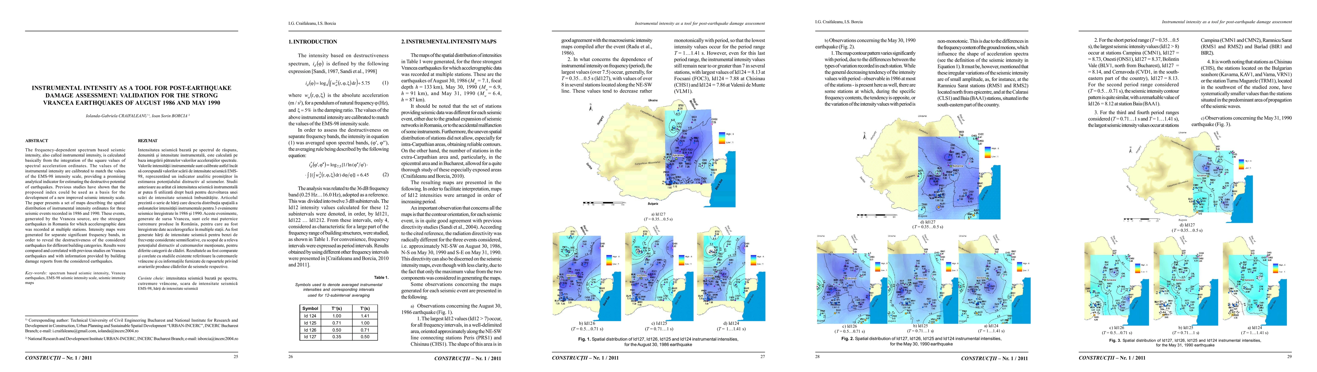 This paper evaluates the use of instrumental intensity, a frequency-dependent seismic intensity measure, for assessing post-earthquake damage, validated through the analysis of strong Vrancea earthquakes in 1986 and 1990. The study correlates instrumental intensity maps with building damage reports to improve seismic intensity scale development.