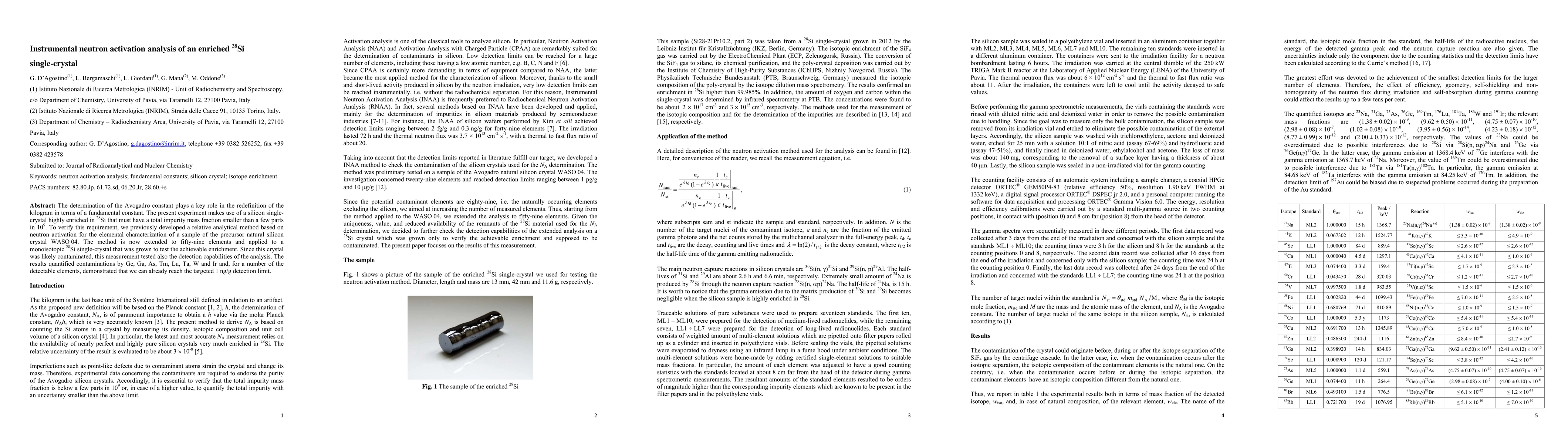 This paper details the use of instrumental neutron activation analysis to characterize an enriched 28Si single-crystal, focusing on verifying its impurity levels below 10^-9. The method successfully detected and quantified contaminations from several elements, demonstrating the capability to reach the targeted detection limit of 1 ng/g.
