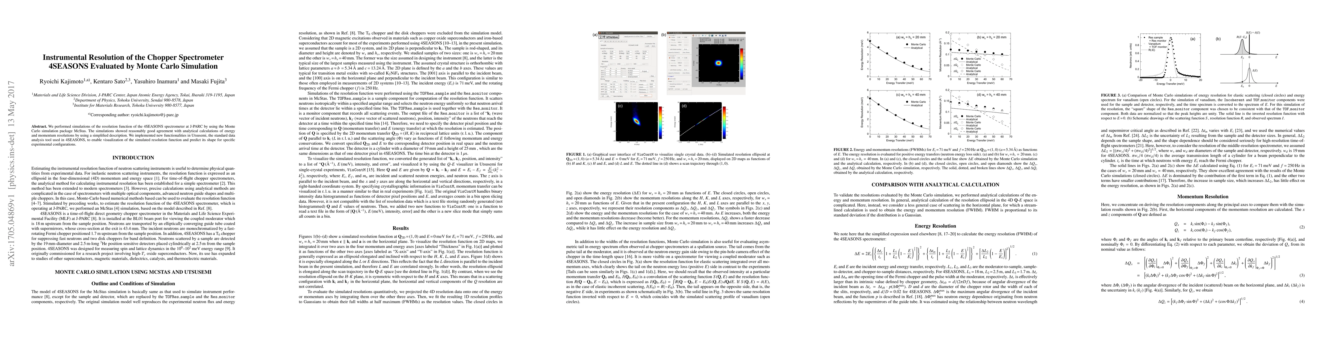 The paper evaluates the resolution function of the 4SEASONS spectrometer using Monte Carlo simulations with McStas, showing good agreement with analytical calculations. New functionalities in the Utsusemi data analysis tool were developed to visualize and predict the simulated resolution function for specific experimental setups.