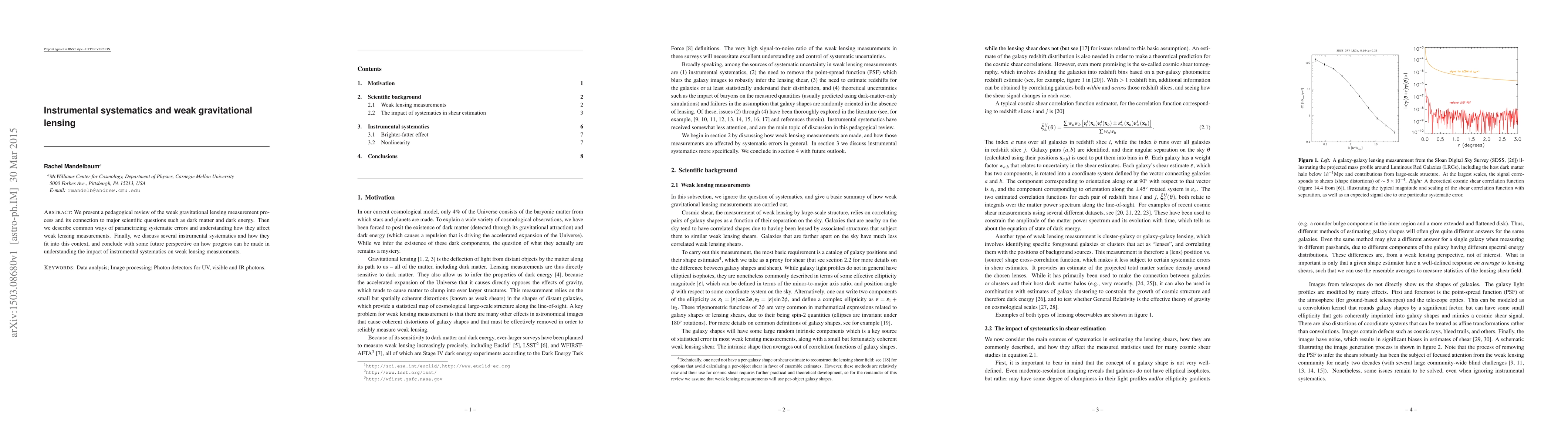 This paper reviews the process of measuring weak gravitational lensing and its implications for dark matter and dark energy. It also discusses systematic errors, particularly instrumental systematics, and their impact on these measurements, concluding with future research directions.