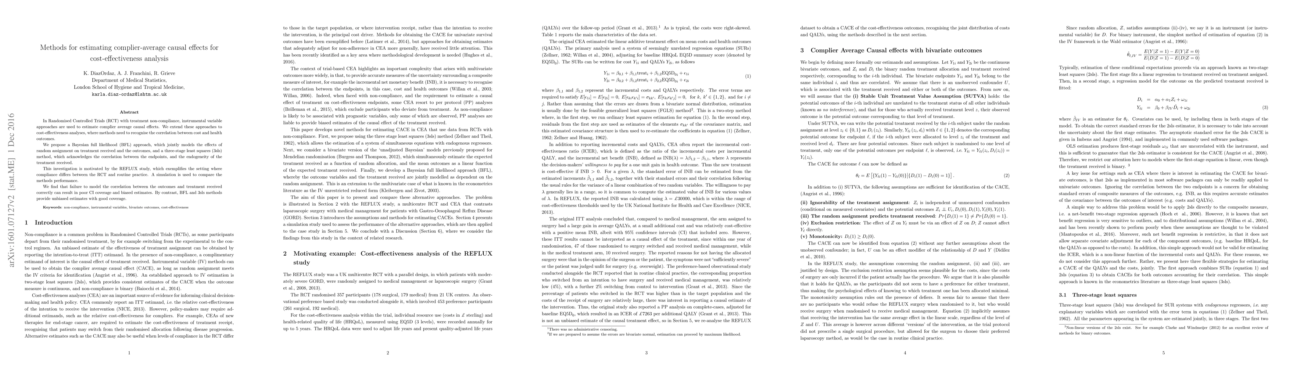 This paper proposes Bayesian full likelihood and three-stage least squares methods to estimate complier average causal effects in RCTs with non-compliance, focusing on correlated cost and health outcomes. Simulation results show that these methods provide unbiased estimates and better coverage compared to methods that ignore outcome correlations.