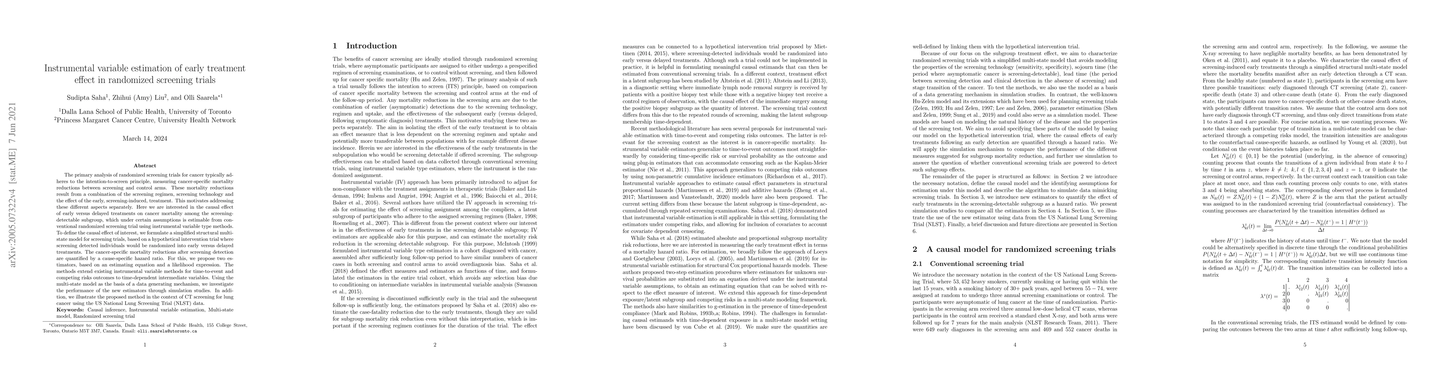 This paper proposes instrumental variable estimation methods to isolate the causal effect of early versus delayed treatment on cancer mortality in randomized screening trials. It introduces two new estimators based on an estimating equation and a likelihood expression, extending existing methods for time-dependent intermediate variables, and demonstrates their application using the US National Lung Screening Trial data.