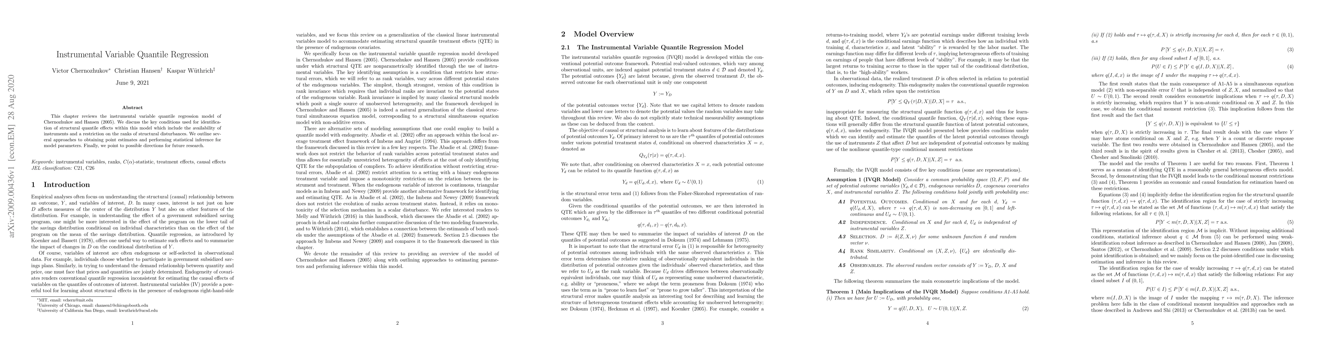 This paper reviews the instrumental variable quantile regression model by Chernozhukov and Hansen (2005), focusing on identification conditions and methods for estimating and testing parameters. It also suggests avenues for future research.
