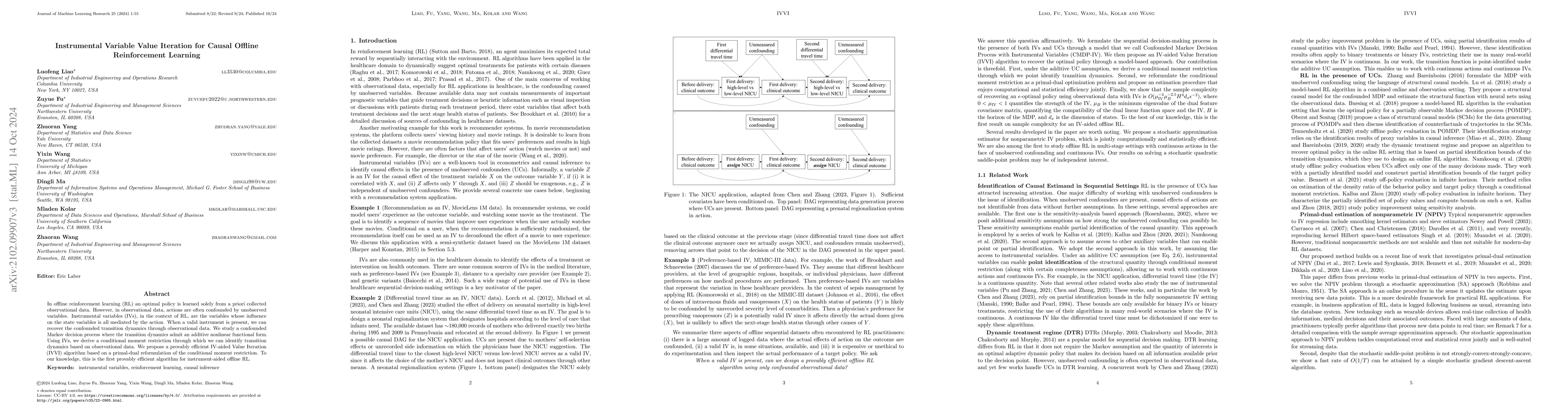 This paper proposes an Instrumental Variable Value Iteration (IVVI) algorithm for causal offline reinforcement learning, leveraging instrumental variables to recover confounded transition dynamics from observational data. The IVVI algorithm is based on a primal-dual reformulation of a conditional moment restriction, offering the first provably efficient solution for instrument-aided offline RL.