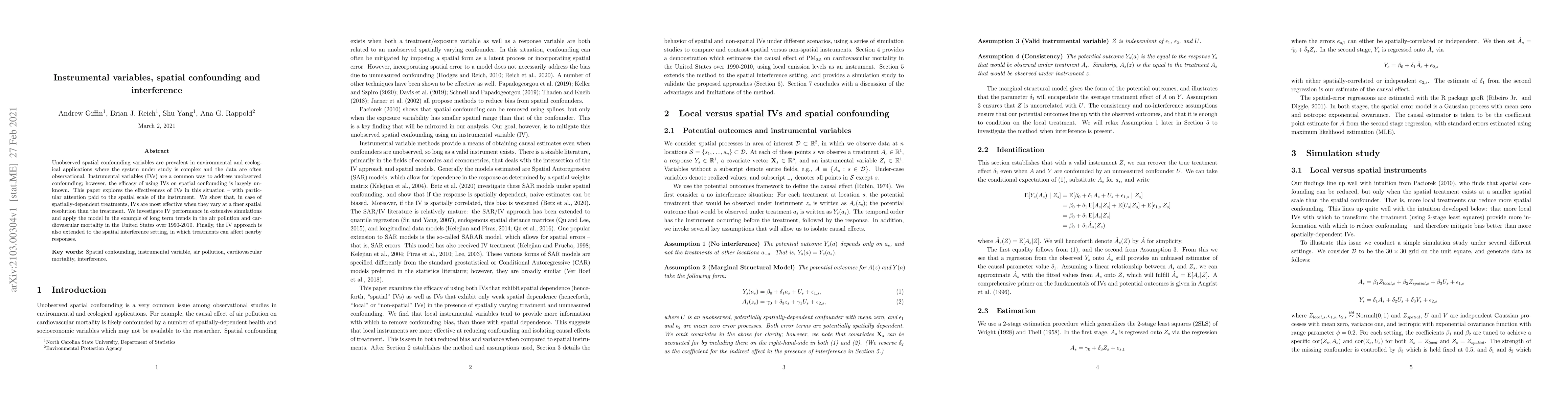This paper examines the efficacy of instrumental variables (IVs) in addressing unobserved spatial confounding in environmental and ecological studies, demonstrating that IVs are most effective when they vary at a finer spatial resolution than the treatment. The study extends the IV approach to spatial interference settings and applies the model to analyze long-term trends in air pollution and cardiovascular mortality in the United States.