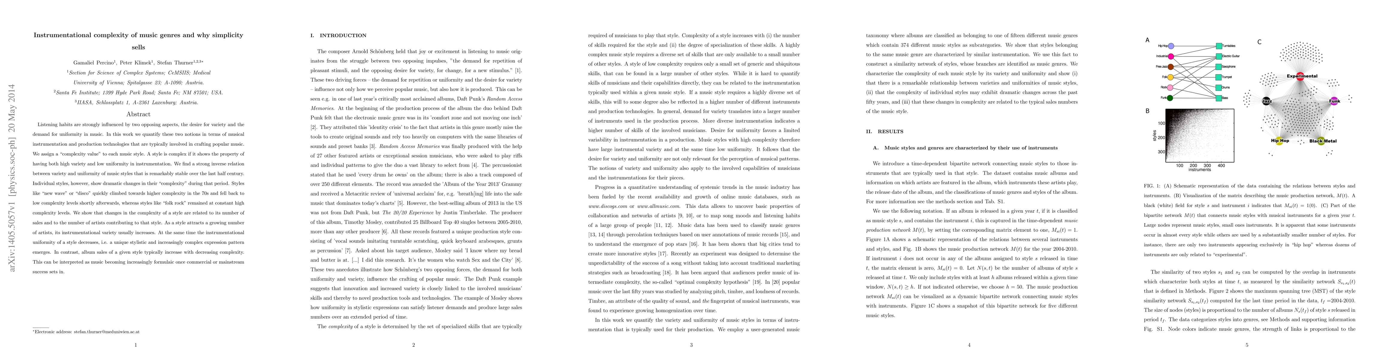 Listening habits are strongly influenced by two opposing aspects, the desire for variety and the demand for uniformity in music. In this work we quantify these two notions in terms of musical instrumentation and production technologies that are typically involved in crafting popular music. We assign a "complexity value" to each music style. A style is complex if it shows the property of having both high variety and low uniformity in instrumentation. We find a strong inverse relation between variety and uniformity of music styles that is remarkably stable over the last half century. Individual styles, however, show dramatic changes in their "complexity" during that period. Styles like "new wave" or "disco" quickly climbed towards higher complexity in the 70s and fell back to low complexity levels shortly afterwards, whereas styles like "folk rock" remained at constant high complexity levels. We show that changes in the complexity of a style are related to its number of sales and to the number of artists contributing to that style. As a style attracts a growing number of artists, its instrumentational variety usually increases. At the same time the instrumentational uniformity of a style decreases, i.e. a unique stylistic and increasingly complex expression pattern emerges. In contrast, album sales of a given style typically increase with decreasing complexity. This can be interpreted as music becoming increasingly formulaic once commercial or mainstream success sets in.