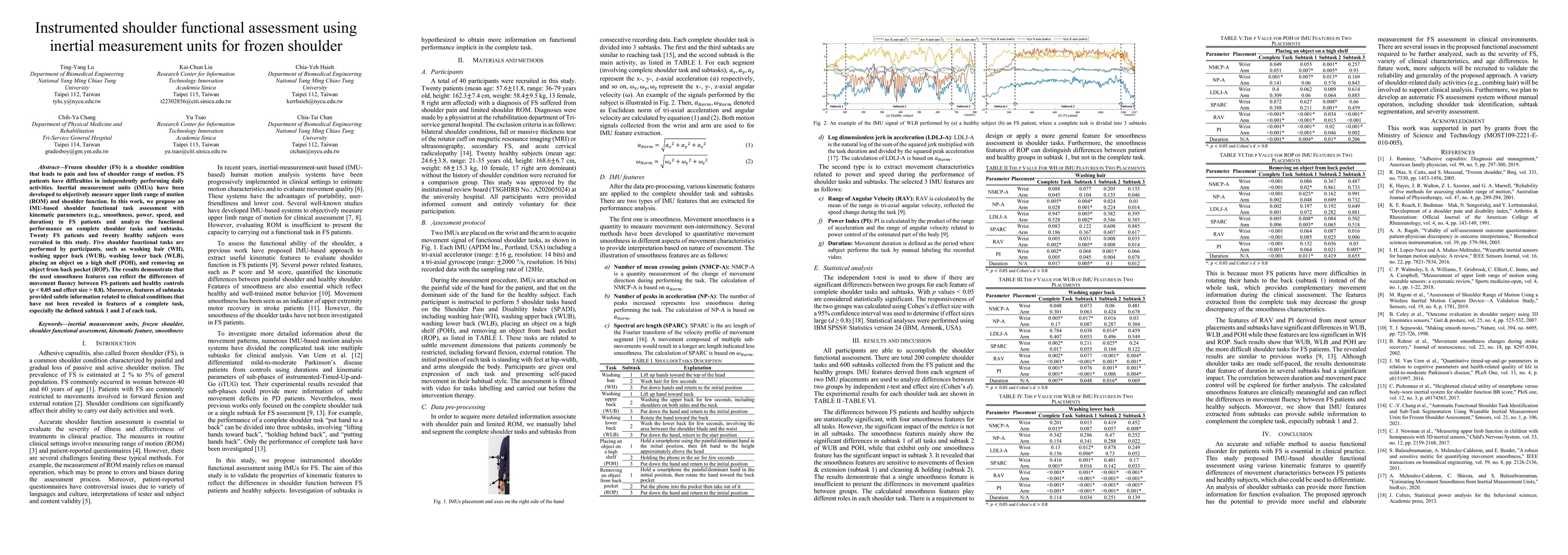 Researchers developed an IMU-based assessment tool to measure shoulder function in people with frozen shoulder, finding that smoothness features can distinguish between patients and healthy controls. The study also identified subtasks as providing valuable information for clinical diagnosis.