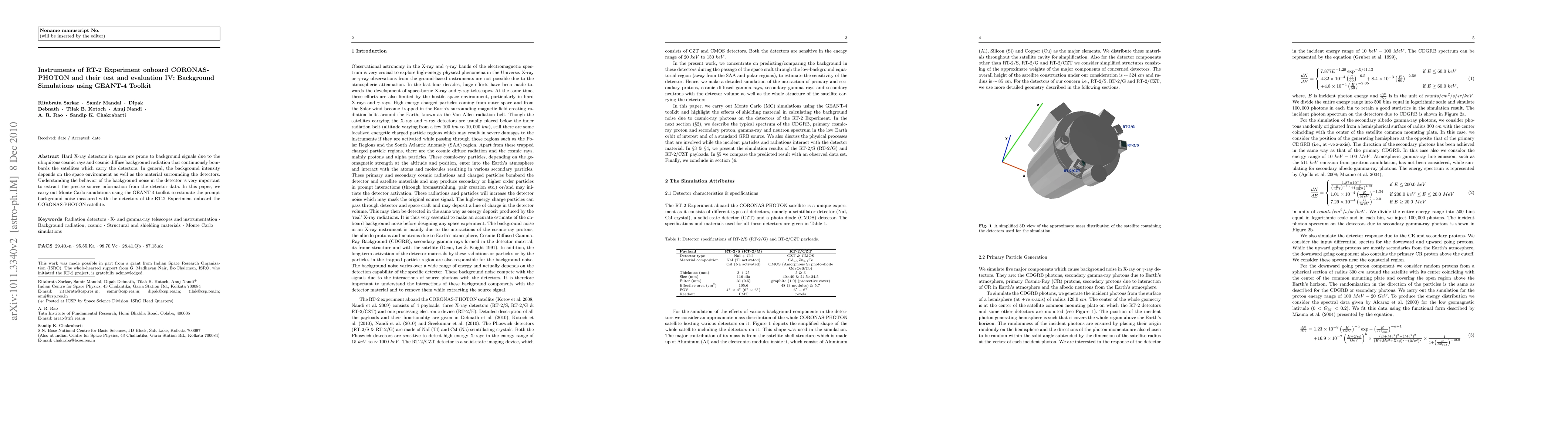 This paper uses Monte Carlo simulations with the GEANT-4 toolkit to estimate the background noise affecting hard X-ray detectors on the CORONAS-PHOTON satellite, aiming to understand the influence of cosmic rays and diffuse background radiation on detector data precision. The study focuses on the RT-2 Experiment's instruments to improve source information extraction.