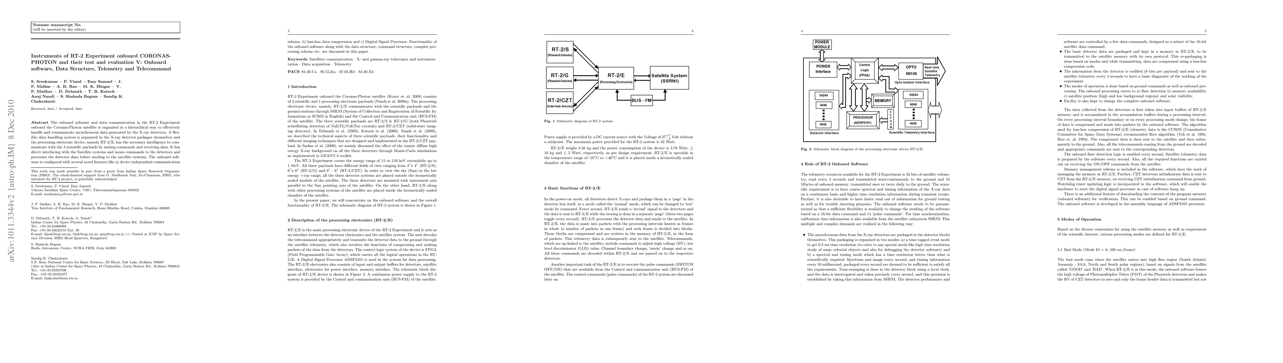 This paper details the hierarchical onboard software and data communication system of the RT-2 Experiment on the Coronas-Photon satellite, emphasizing its flexible data handling, loss-less compression, and novel features like device independent communication and a Digital Signal Processor. The software interfaces directly with satellite systems to manage detector commands and data processing.