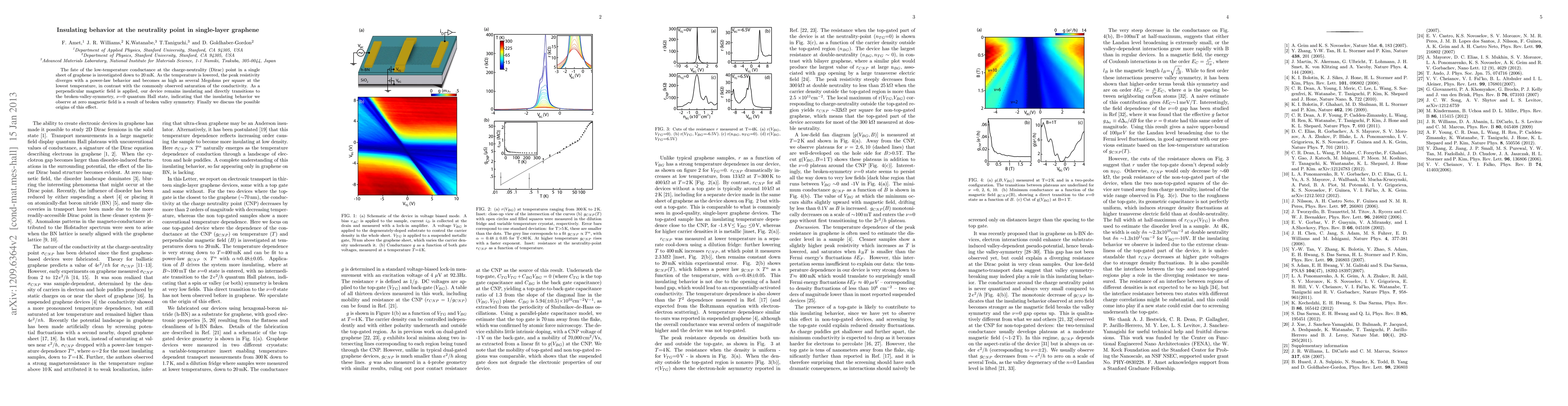 This study investigates the insulating behavior at the charge-neutrality point in dual-gated, single-layer graphene, revealing a peak resistivity that diverges with temperature and remains insulating under magnetic fields, indicating broken valley symmetry. The observed insulating behavior contrasts with typical conductivity saturation trends.