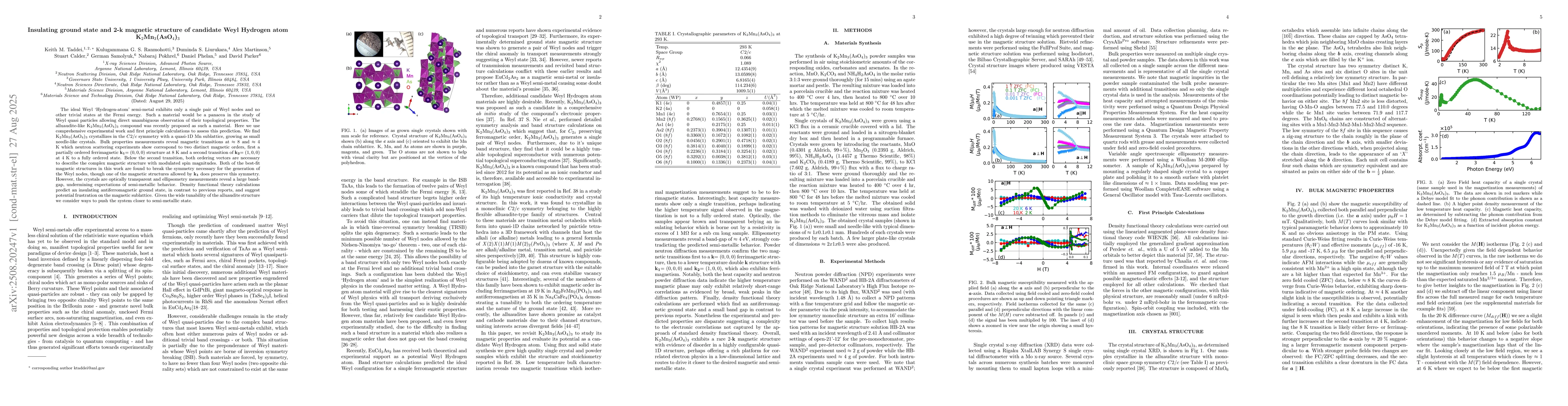 The ideal Weyl 'Hydrogen-atom' semi-metal exhibits only a single pair of Weyl nodes and no other trivial states at the Fermi energy. Such a material would be a panacea in the study of Weyl quasi particles allowing direct unambiguous observation of their topological properties. The alluaudite-like K$_2$Mn$_3$(AsO$_4$)$_3$ compound was recently proposed as such a material. Here we use comprehensive experimental work and first principle calculations to assess this prediction. We find K$_2$Mn$_3$(AsO$_4$)$_3$ crystallizes in the $C2/c$ symmetry with a quasi-1D Mn sublattice, growing as small needle-like crystals. Bulk properties measurements reveal magnetic transitions at $\approx$ 8 and $\approx$ 4 K which neutron scattering experiments show correspond to two distinct magnetic orders, first a partially ordered ferrimagnetic $\mathbf{k_1}$= (0, 0, 0) structure at 8 K and a second transition of $\mathbf{k_2}$= (1, 0, 0) at 4 K to a fully ordered state. Below the second transition, both ordering vectors are necessary to describe the complex magnetic structure with modulated spin magnitudes. Both of the best-fit magnetic structures in this work are found to break the symmetry necessary for the generation of the Weyl nodes, though one of the magnetic structures allowed by $\mathbf{k_1}$ does preserve this symmetry. However, the crystals are optically transparent and ellipsometry measurements reveal a large band-gap, undermining expectations of semi-metallic behavior. Density functional theory calculations predict an insulating antiferromagnetic ground state, in contrast to previous reports, and suggest potential frustration on the magnetic sublattice. Given the wide tunability of the alluaudite structure we consider ways to push the system closer to semi-metallic state.