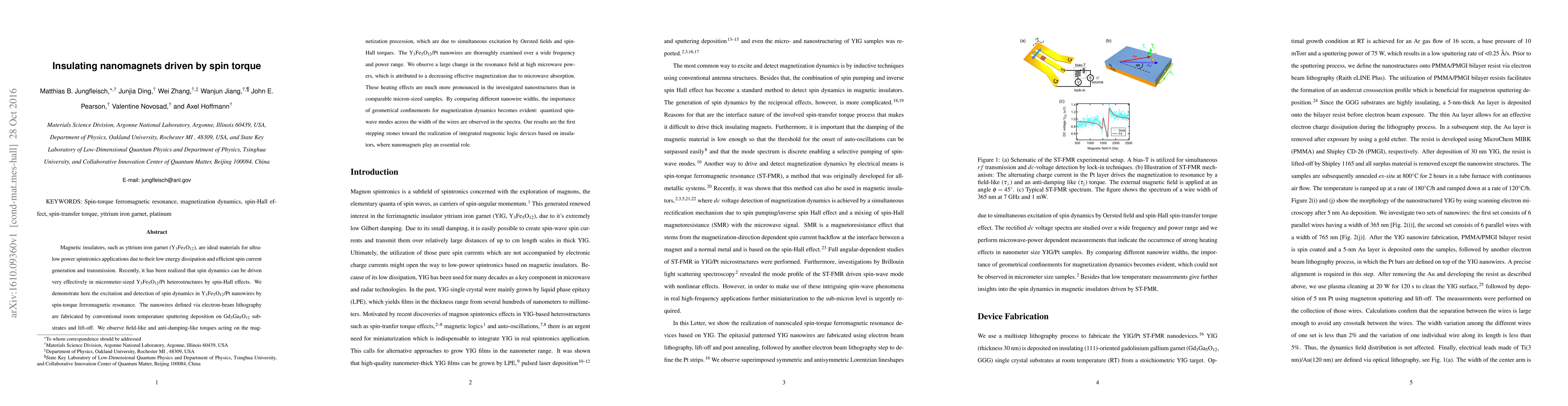 Magnetic insulators, such as yttrium iron garnet (Y$_3$Fe$_5$O$_{12}$), are ideal materials for ultra-low power spintronics applications due to their low energy dissipation and efficient spin current generation and transmission. Recently, it has been realized that spin dynamics can be driven very effectively in micrometer-sized Y$_3$Fe$_5$O$_{12}$/Pt heterostructures by spin-Hall effects. We demonstrate here the excitation and detection of spin dynamics in Y$_3$Fe$_5$O$_{12}$/Pt nanowires by spin-torque ferromagnetic resonance. The nanowires defined via electron-beam lithography are fabricated by conventional room temperature sputtering deposition on Gd$_3$Ga$_5$O$_{12 }$ substrates and lift-off. We observe field-like and anti-damping-like torques acting on the magnetization precession, which are due to simultaneous excitation by Oersted fields and spin-Hall torques. The Y$_3$Fe$_5$O$_{12}$/Pt nanowires are thoroughly examined over a wide frequency and power range. We observe a large change in the resonance field at high microwave powers, which is attributed to a decreasing effective magnetization due to microwave absorption. These heating effects are much more pronounced in the investigated nanostructures than in comparable micron-sized samples. By comparing different nanowire widths, the importance of geometrical confinements for magnetization dynamics becomes evident: quantized spin-wave modes across the width of the wires are observed in the spectra. Our results are the first stepping stones toward the realization of integrated magnonic logic devices based on insulators, where nanomagnets play an essential role.