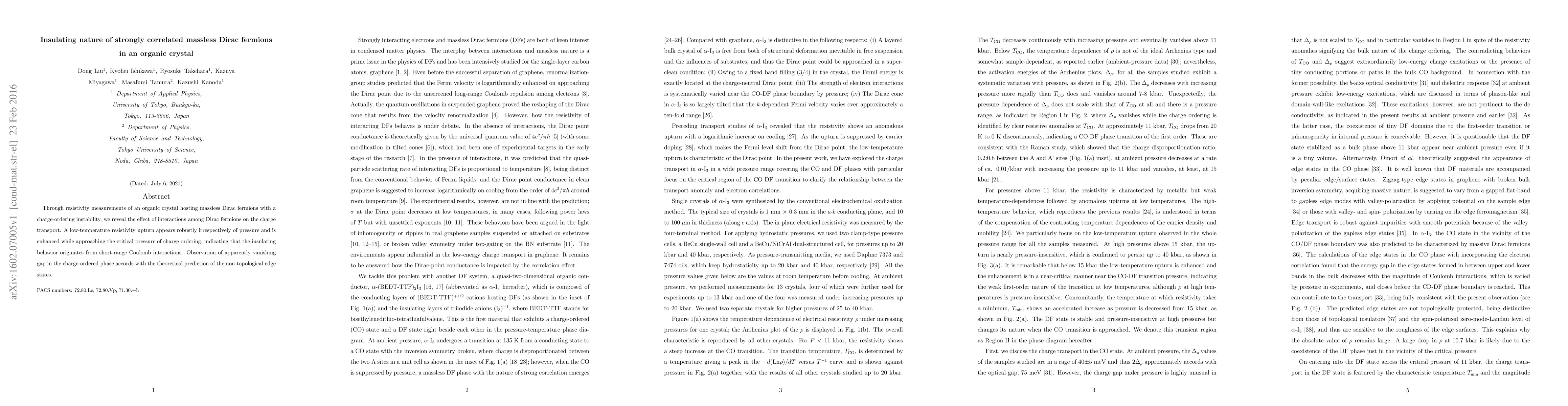 Researchers found that massless Dirac fermions in an organic crystal exhibit insulating behavior due to short-range Coulomb interactions, regardless of pressure changes. This suggests the presence of non-topological edge states with a vanishing gap.