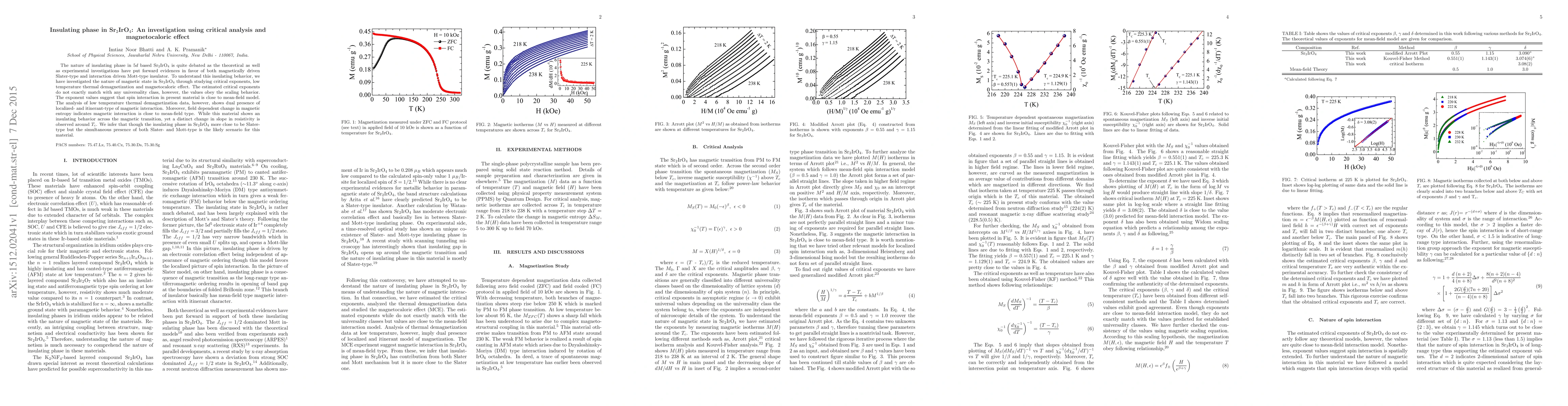 The nature of insulating phase in 5$d$ based Sr$_2$IrO$_4$ is quite debated as the theoretical as well as experimental investigations have put forward evidences in favor of both magnetically driven Slater-type and interaction driven Mott-type insulator. To understand this insulating behavior, we have investigated the nature of magnetic state in Sr$_2$IrO$_4$ through studying critical exponents, low temperature thermal demagnetization and magnetocaloric effect. The estimated critical exponents do not exactly match with any universality class, however, the values obey the scaling behavior. The exponent values suggest that spin interaction in present material is close to mean-field model. The analysis of low temperature thermal demagnetization data, however, shows dual presence of localized- and itinerant-type of magnetic interaction. Moreover, field dependent change in magnetic entropy indicates magnetic interaction is close to mean-field type. While this material shows an insulating behavior across the magnetic transition, yet a distinct change in slope in resistivity is observed around $T_c$. We infer that though the insulating phase in Sr$_2$IrO$_4$ more close to be Slater-type but the simultaneous presence of both Slater- and Mott-type is the likely scenario for this material.