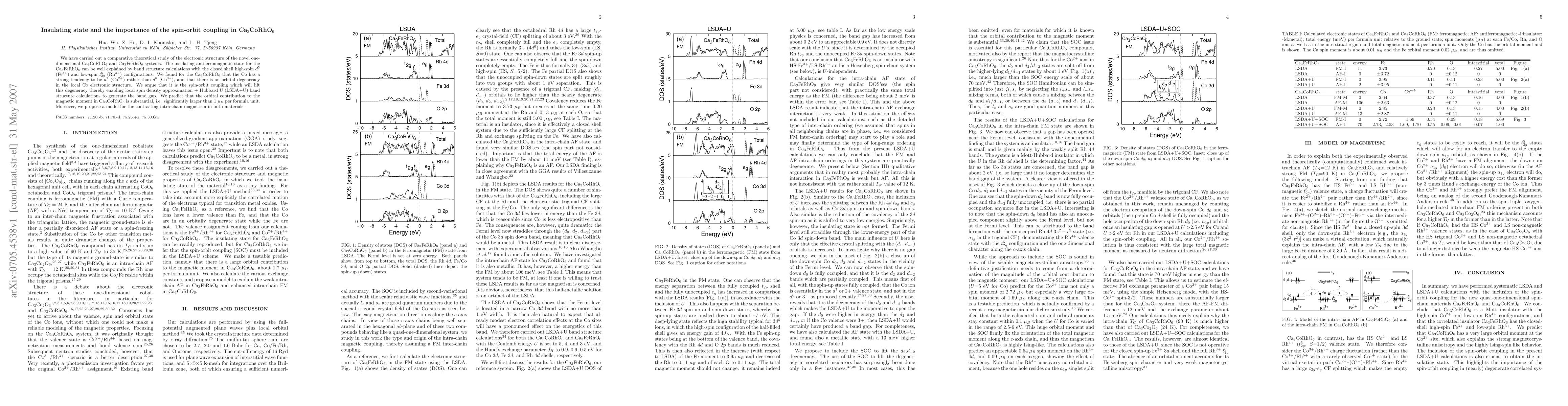 We have carried out a comparative theoretical study of the electronic structure of the novel one-dimensional Ca$_3$CoRhO$_6$ and Ca$_3$FeRhO$_6$ systems. The insulating antiferromagnetic state for the Ca$_3$FeRhO$_6$ can be well explained by band structure calculations with the closed shell high-spin $d^5$ (Fe$^{3+}$) and low-spin $t_{2g}^{6}$ (Rh$^{3+}$) configurations. We found for the Ca$_3$CoRhO$_6$ that the Co has a strong tendency to be $d^7$ (Co$^{2+}$) rather than $d^6$ (Co$^{3+}$), and that there is an orbital degeneracy in the local Co electronic structure. We argue that it is the spin-orbit coupling which will lift this degeneracy thereby enabling local spin density approximation + Hubbard U (LSDA+U) band structure calculations to generate the band gap. We predict that the orbital contribution to the magnetic moment in Ca$_3$CoRhO$_6$ is substantial, i.e. significantly larger than 1 $\mu_B$ per formula unit. Moreover, we propose a model for the contrasting intra-chain magnetism in both materials.