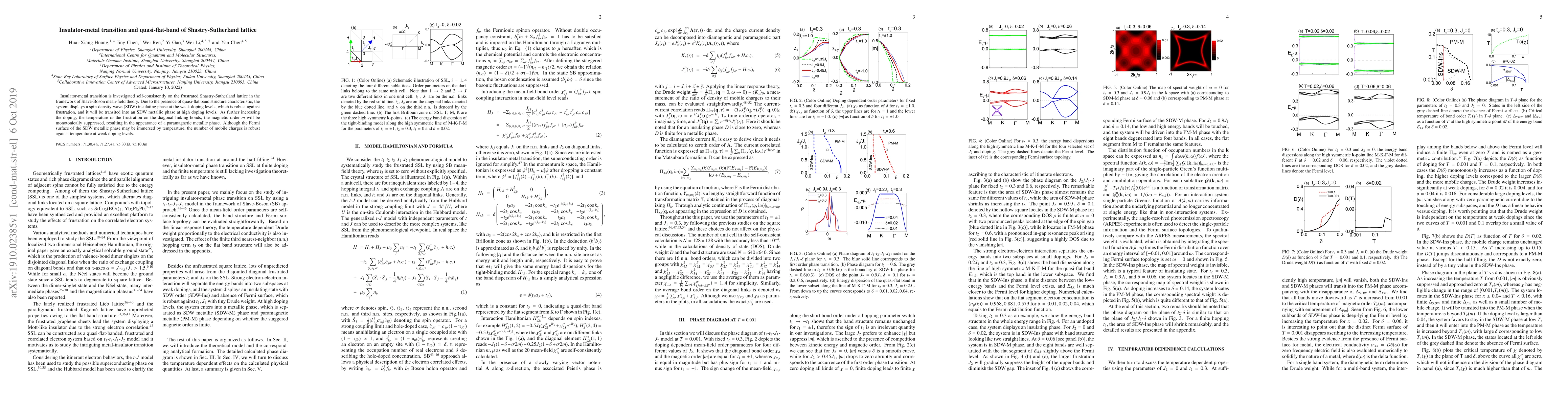 Insulator-metal transition is investigated self-consistently on the frustrated Shastry-Sutherland lattice in the framework of Slave-Boson mean-field theory. Due to the presence of quasi-flat band structure characteristic, the system displays a spin-density-wave (SDW) insulating phase at the weak doping levels, which is robust against frustration, and it will be transited into an SDW metallic phase at high doping levels. As further increasing the doping, the temperature or the frustration on the diagonal linking bonds, the magnetic order $m$ will be monotonically suppressed, resulting in the appearance of a paramagnetic metallic phase. Although the Fermi surface of the SDW metallic phase may be immersed by temperature, the number of mobile charges is robust against temperature at weak doping levels.