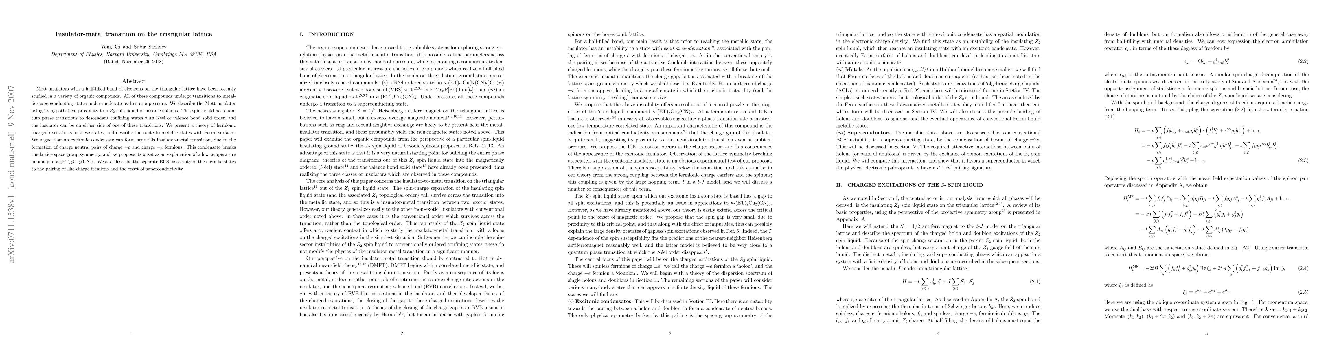 This paper explores the insulator-metal transition in Mott insulators on a triangular lattice, proposing a theoretical framework for the transition via an excitonic condensate and discussing the potential for superconductivity in the metallic state. The study connects the transition to quantum phase transitions in a Z_2 spin liquid and identifies a low-temperature anomaly in kappa-(ET)2Cu2(CN)3 as evidence of this condensate.