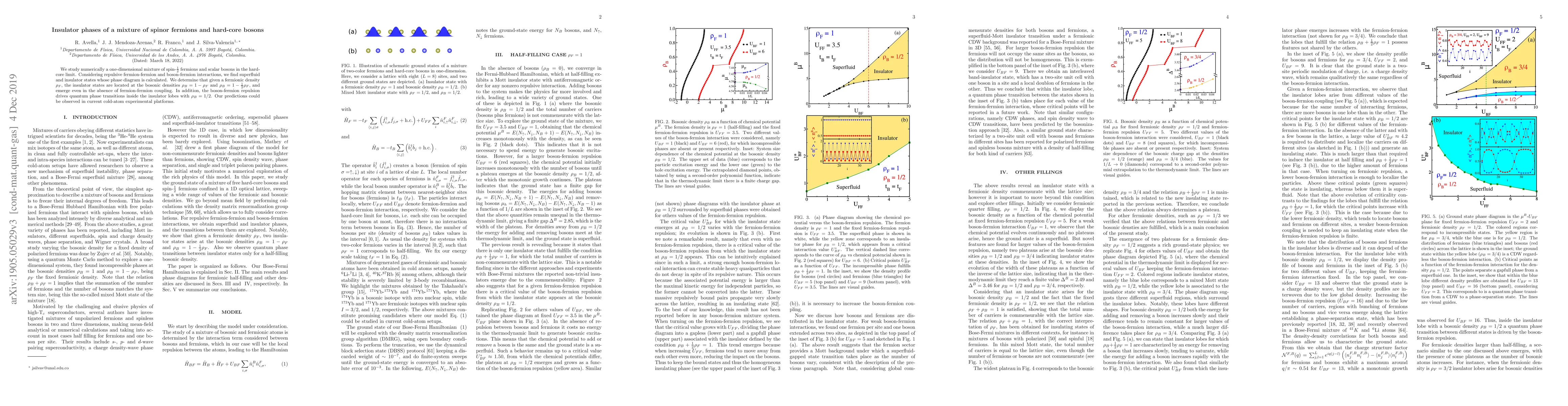 We study numerically a one-dimensional mixture of spin-$\tfrac{1}{2}$ fermions and scalar bosons in the hard-core limit. Considering repulsive fermion-fermion and boson-fermion interactions, we find superfluid and insulator states whose phase diagram is calculated. We determine that given a fermionic density $\rho_F$, the insulator states are located at the bosonic densities $\rho_B=1-\rho_F$ and $\rho_B=1-\tfrac{1}{2}\rho_F$, and emerge even in the absence of fermion-fermion coupling. In addition, the boson-fermion repulsion drives quantum phase transitions inside the insulator lobes with $\rho_B=1/2$. Our predictions could be observed in current cold-atom experimental platforms.