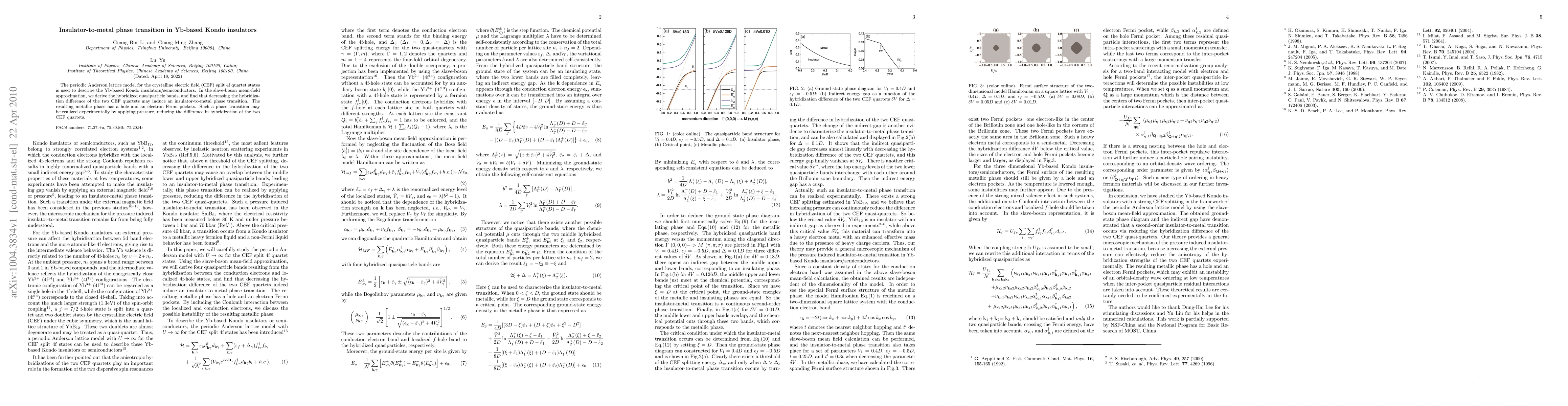 The periodic Anderson lattice model for the crystalline electric field (CEF)split 4f quartet states is used to describe the Yb-based Kondo insulators/semiconductors. In the slave-boson mean-field approximation, we derive the hybridized quasiparticle bands, and find that decreasing the hybridization difference of the two CEF quartets may induce an insulator-to-metal phase transition. The resulting metallic phase has a hole and an electron Fermi pockets. Such a phase transition may be realized experimentally by applying pressure, reducing the difference in hybridization of the two CEF quartets.