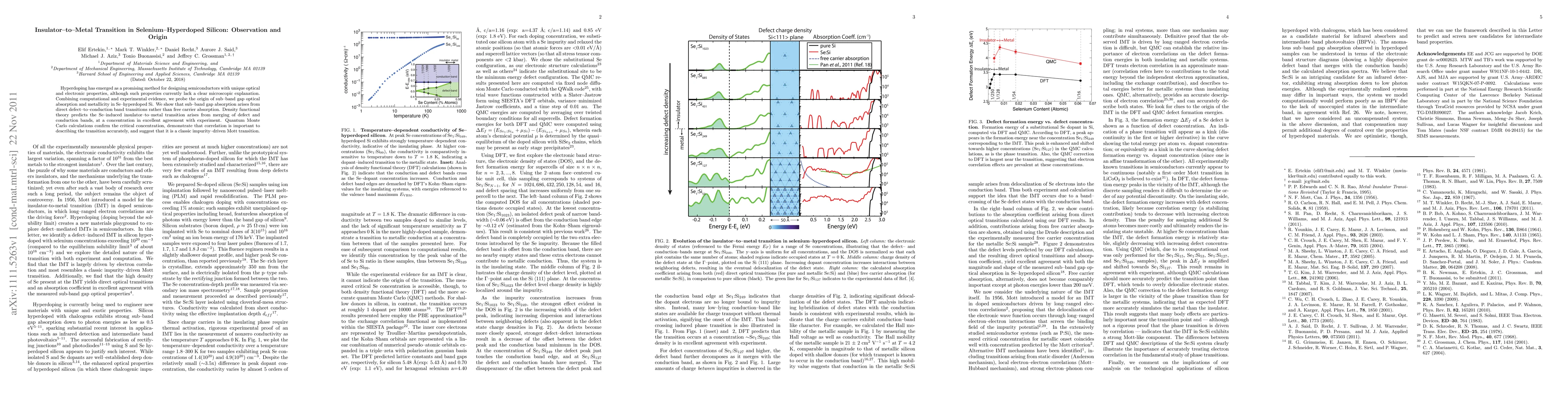 Hyperdoping has emerged as a promising method for designing semiconductors with unique optical and electronic properties, although such properties currently lack a clear microscopic explanation. Combining computational and experimental evidence, we probe the origin of sub-band gap optical absorption and metallicity in Se-hyperdoped Si. We show that sub-band gap absorption arises from direct defect-to-conduction band transitions rather than free carrier absorption. Density functional theory predicts the Se-induced insulator-to-metal transition arises from merging of defect and conduction bands, at a concentration in excellent agreement with experiment. Quantum Monte Carlo calculations confirm the critical concentration, demonstrate that correlation is important to describing the transition accurately, and suggest that it is a classic impurity-driven Mott transition.