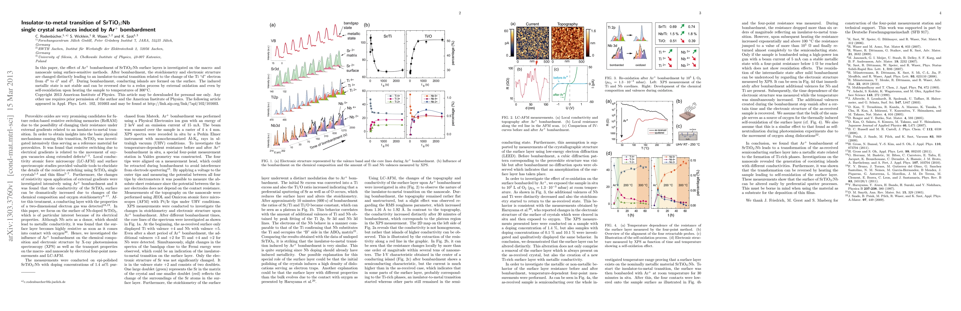 SrTiO3:Nb single crystal surfaces undergo an insulator-to-metal transition after Ar+ bombardment, forming conducting islands that can be reversed through external oxidation or self-reoxidation.