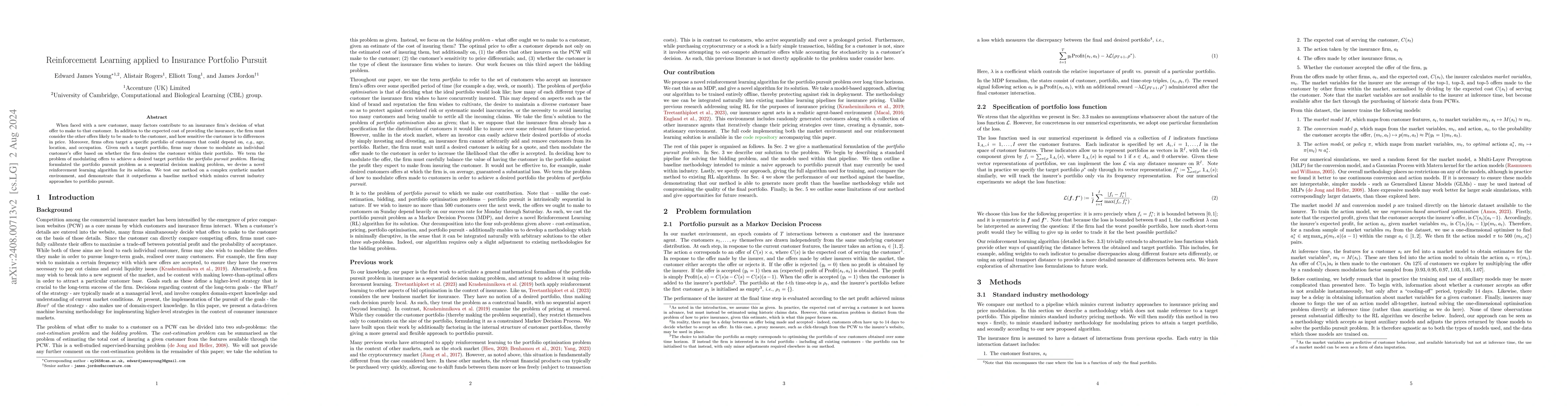 The paper proposes a reinforcement learning algorithm to solve the insurance portfolio pursuit problem, which involves adjusting offers to specific customers based on desired portfolio characteristics. The method outperforms existing industry approaches in a synthetic market environment.