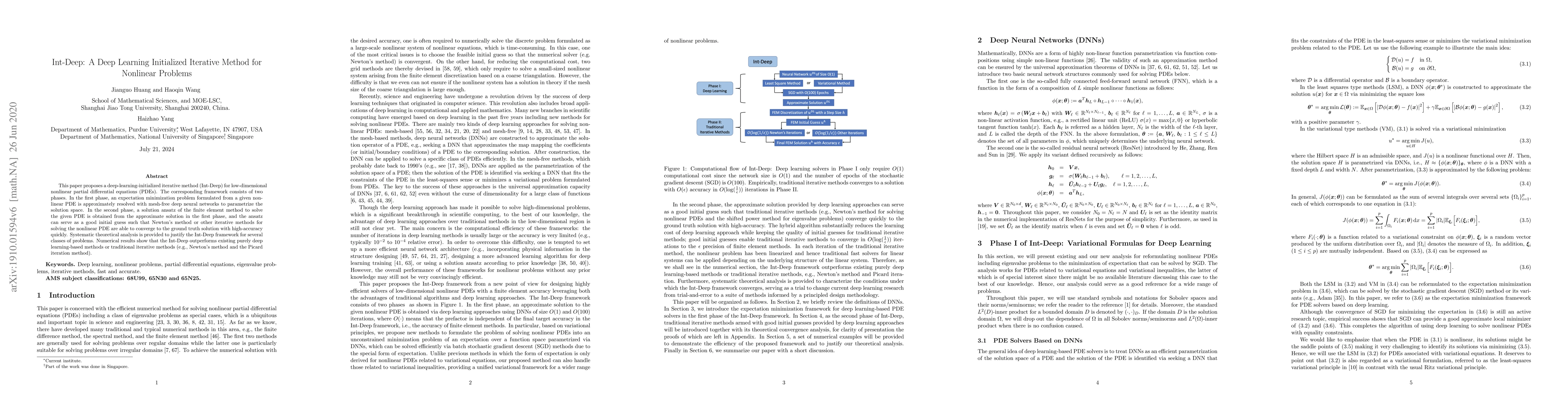 This paper introduces Int-Deep, a deep learning initialized iterative method for solving low-dimensional nonlinear partial differential equations (PDEs). It combines deep neural networks for approximation and finite element method for refinement, outperforming purely deep learning-based methods and traditional iterative methods in accuracy and speed.