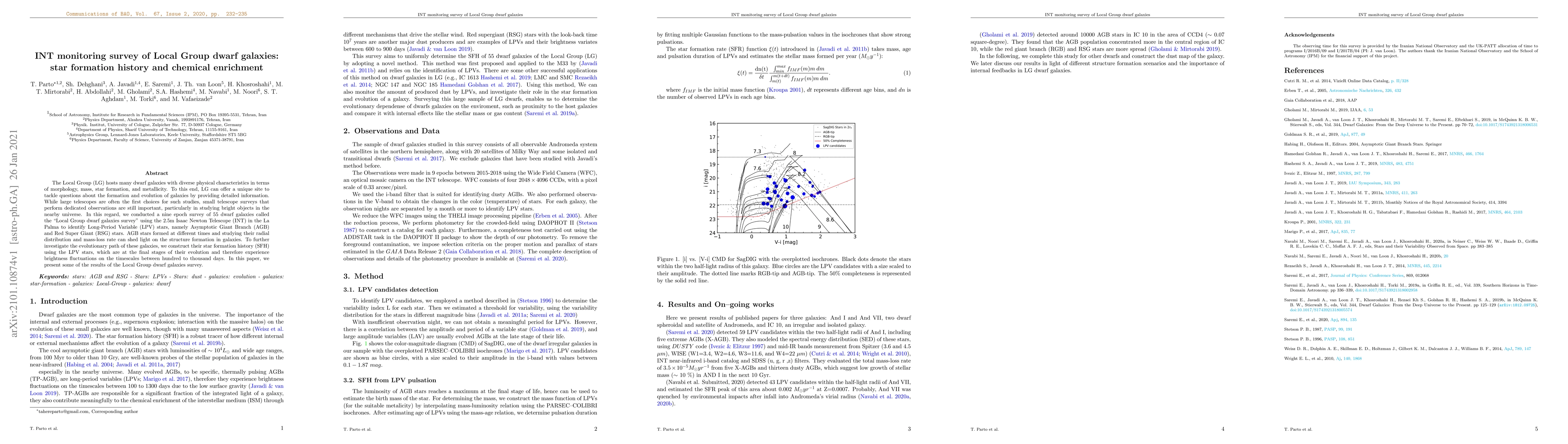 This paper reports on a nine-epoch survey of 55 Local Group dwarf galaxies using the Isaac Newton Telescope to identify Long-Period Variable stars, aiming to reconstruct the star formation history and chemical enrichment of these galaxies. The study focuses on Asymptotic Giant Branch and Red Super Giant stars to understand their evolutionary paths and the structure formation in these galaxies.