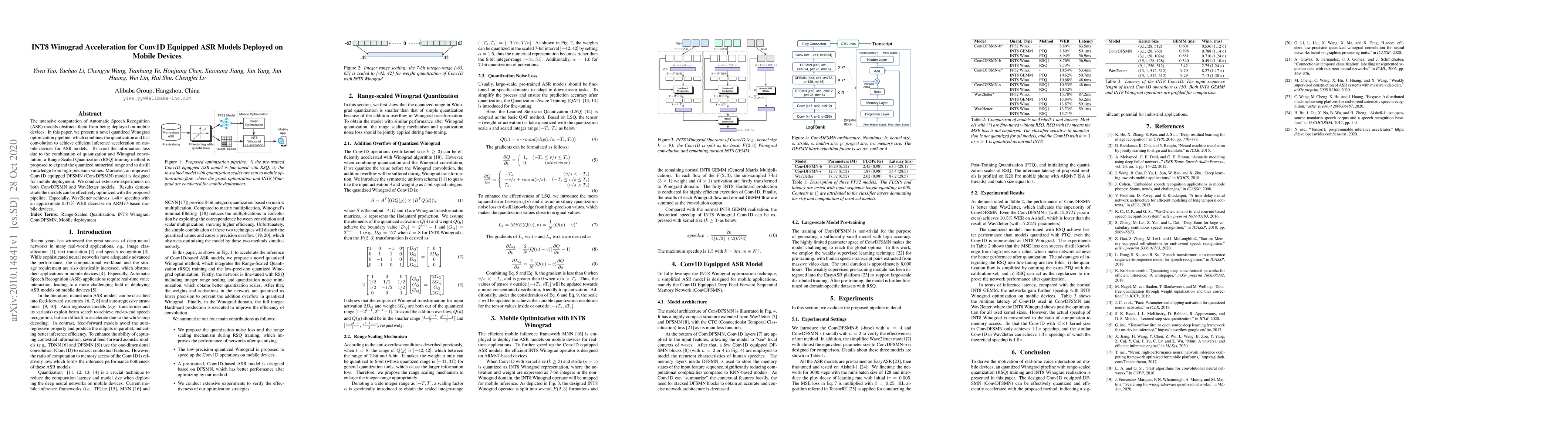 This paper proposes a quantized Winograd optimization pipeline for efficient inference of Conv1D equipped ASR models on mobile devices, combining quantization and fast convolution. It introduces a Range-Scaled Quantization training method to mitigate information loss and presents an improved ConvDFSMN model, achieving a 1.48x speedup with minimal WER loss on ARMv7 devices.