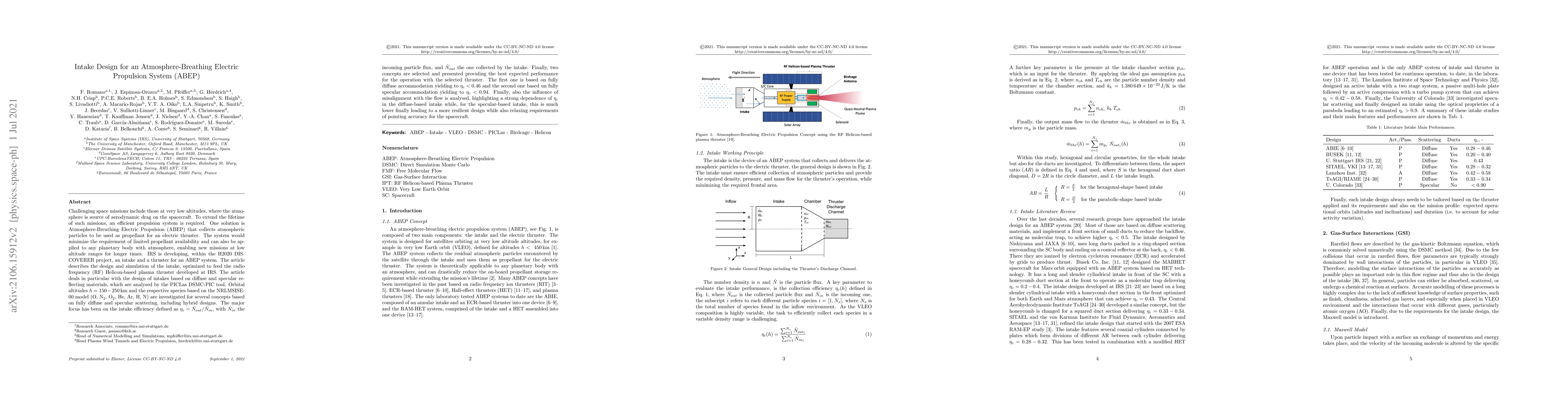 This work introduces novel intake concepts for ABEP systems, providing improved performance compared to existing designs, and highlights the importance of material accommodation properties in intake efficiency.