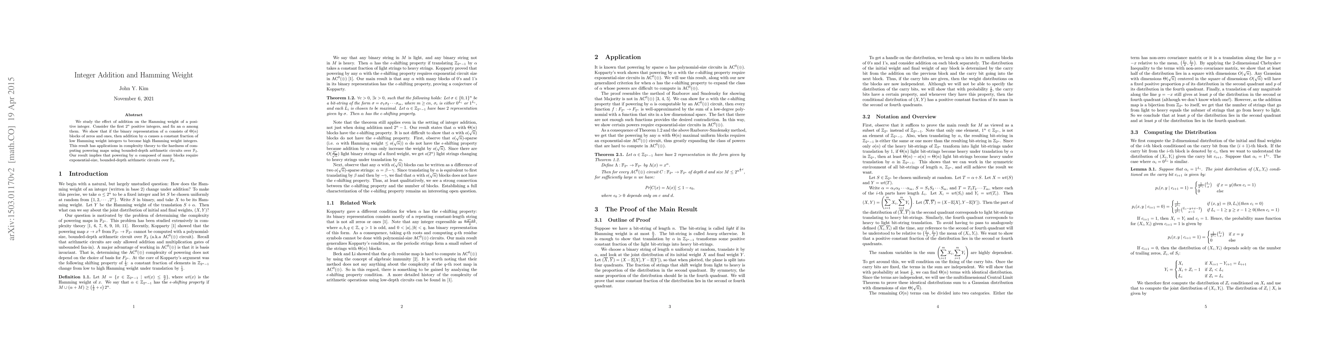 This paper investigates how addition of a specific integer $\alpha$ affects the Hamming weight of other integers, demonstrating that it can transform a constant fraction of low Hamming weight integers into high Hamming weight integers. This finding has implications for complexity theory, particularly in showing that powering by $\alpha$ necessitates exponential-size, bounded-depth arithmetic circuits over $\mathbb{F}_2$.