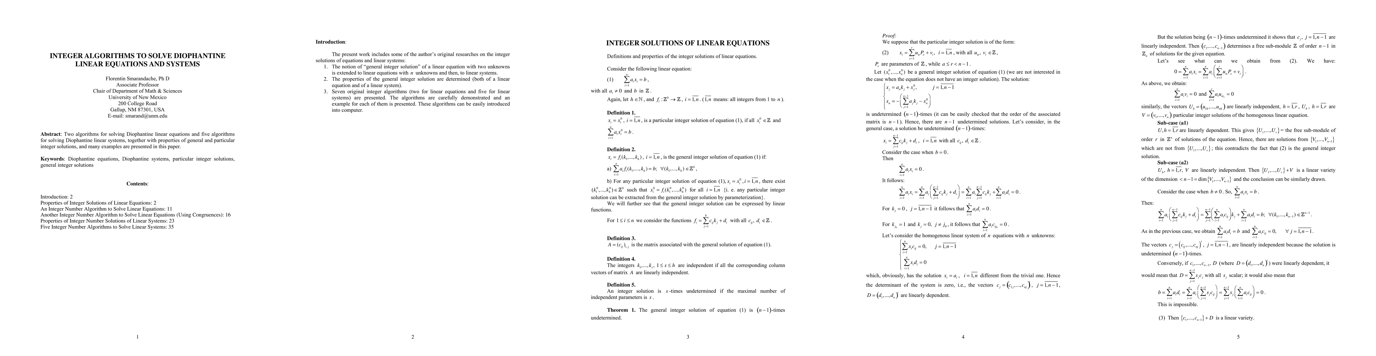 This paper presents original research on integer solutions for Diophantine linear equations and systems, extending the concept of general integer solutions to multiple unknowns. It introduces seven new integer algorithms, rigorously proves them, and provides examples for each, emphasizing their computational implementability.