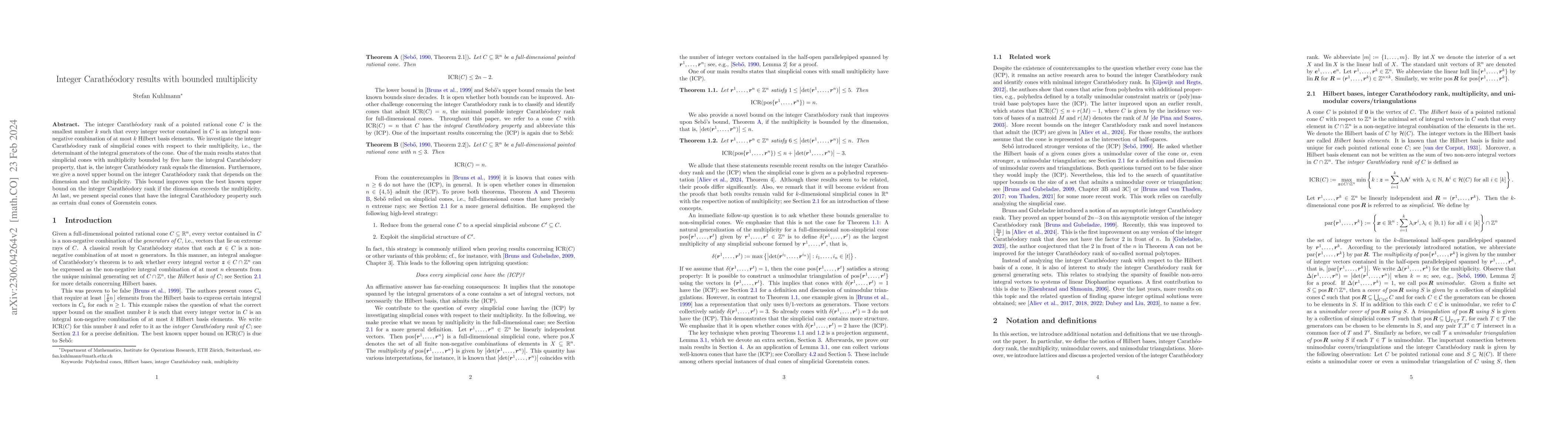 The integer Carath\'eodory rank of a pointed rational cone $C$ is the smallest number $k$ such that every integer vector contained in $C$ is an integral non-negative combination of at most $k$ Hilbert basis elements. We investigate the integer Carath\'eodory rank of simplicial cones with respect to their multiplicity, i.e., the determinant of the integral generators of the cone. One of the main results states that simplicial cones with multiplicity bounded by five have the integral Carath\'eodory property, that is, the integer Carath\'eodory rank equals the dimension. Furthermore, we present a novel upper bound on the integer Carath\'eodory rank which depends on the dimension and the multiplicity. This bound improves upon the best known upper bound on the integer Carath\'eodory rank if the dimension exceeds the multiplicity. At last, we present special cones which have the integral Carath\'eodory property such as certain dual cones of Gorenstein cones.