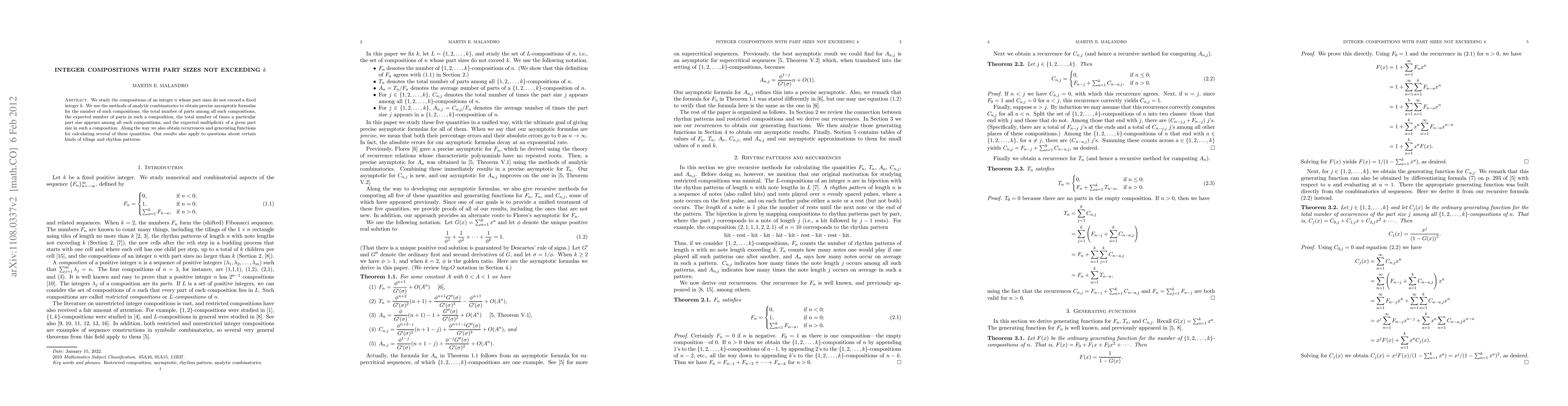 This paper uses analytic combinatorics to derive asymptotic formulas for integer compositions of n where each part size does not exceed k, including the total number of parts, expected part count, and part size multiplicity. It also provides recurrences and generating functions for these calculations, with applications to tilings and rhythm patterns.