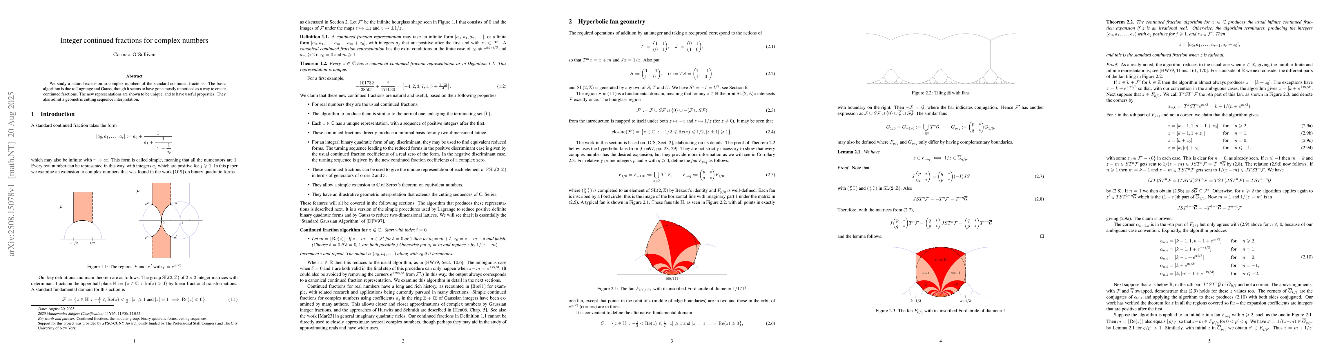 We study a natural extension to complex numbers of the standard continued fractions. The basic algorithm is due to Lagrange and Gauss, though it seems to have gone mostly unnoticed as a way to create continued fractions. The new representations are shown to be unique, and to have useful properties. They also admit a geometric cutting sequence interpretation.