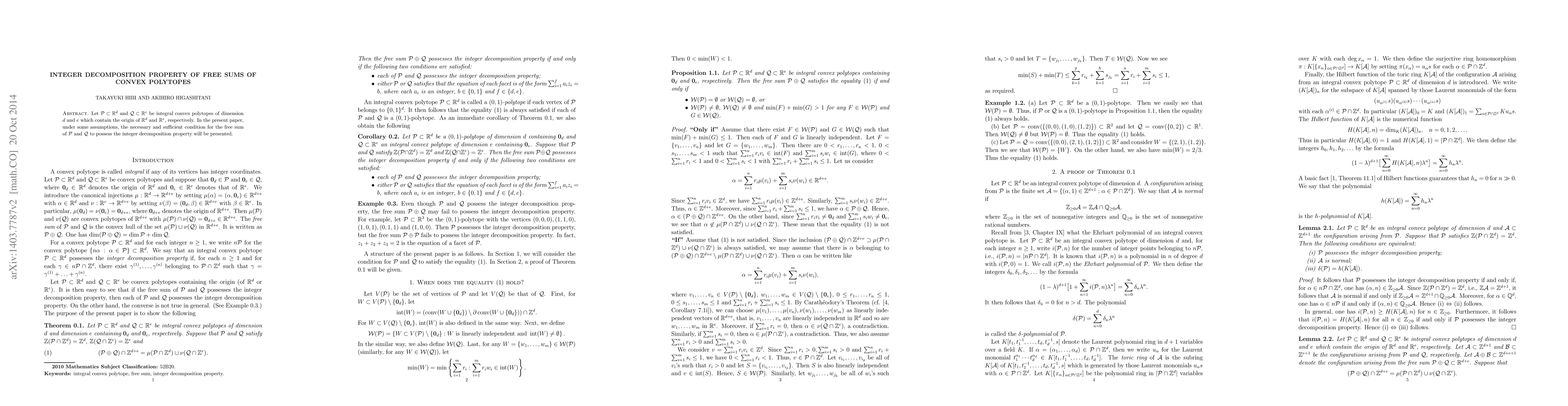 This paper explores the integer decomposition property of the free sum of two integral convex polytopes $\mathcal{P}$ and $\mathcal{Q}$, providing a necessary and sufficient condition for this property under specific assumptions.