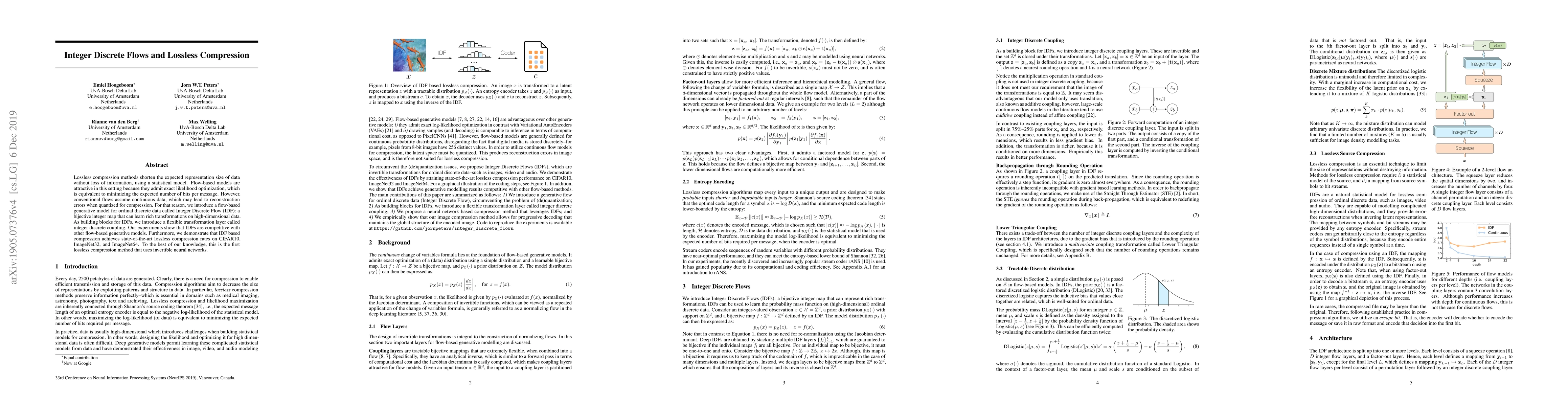 This paper introduces Integer Discrete Flows (IDF), a novel flow-based generative model for compressing ordinal discrete data without information loss. IDFs utilize an integer discrete coupling transformation layer, achieving competitive performance and state-of-the-art lossless compression rates on datasets like CIFAR10 and ImageNet.