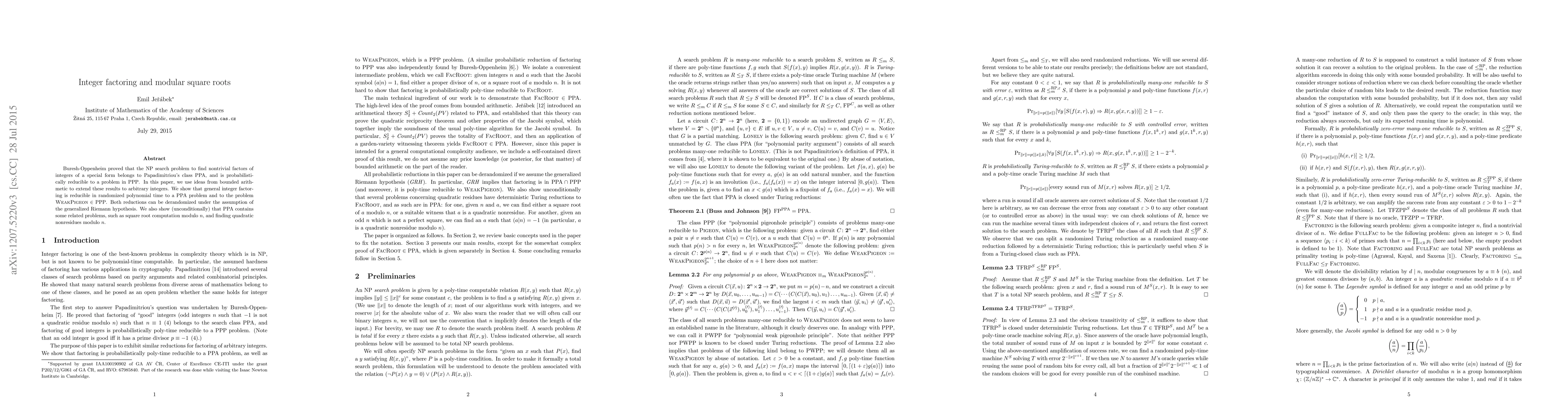 The paper shows that general integer factoring can be reduced to problems in class PPA and PPP with randomized polynomial time complexity, which can be derandomized under the generalized Riemann hypothesis.