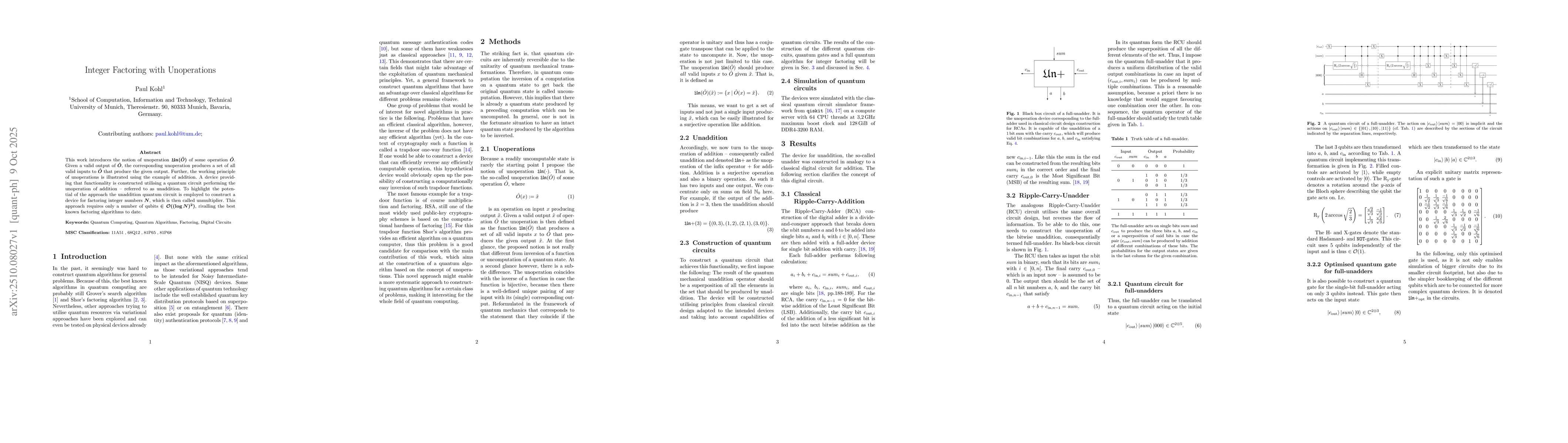 The research introduces the concept of unoperations, specifically focusing on constructing quantum circuits for unaddition and unmultiplier to factor integers. It uses quantum circuits with optimized full-unadder gates and simulates their behavior using quantum computing frameworks like Qiskit.