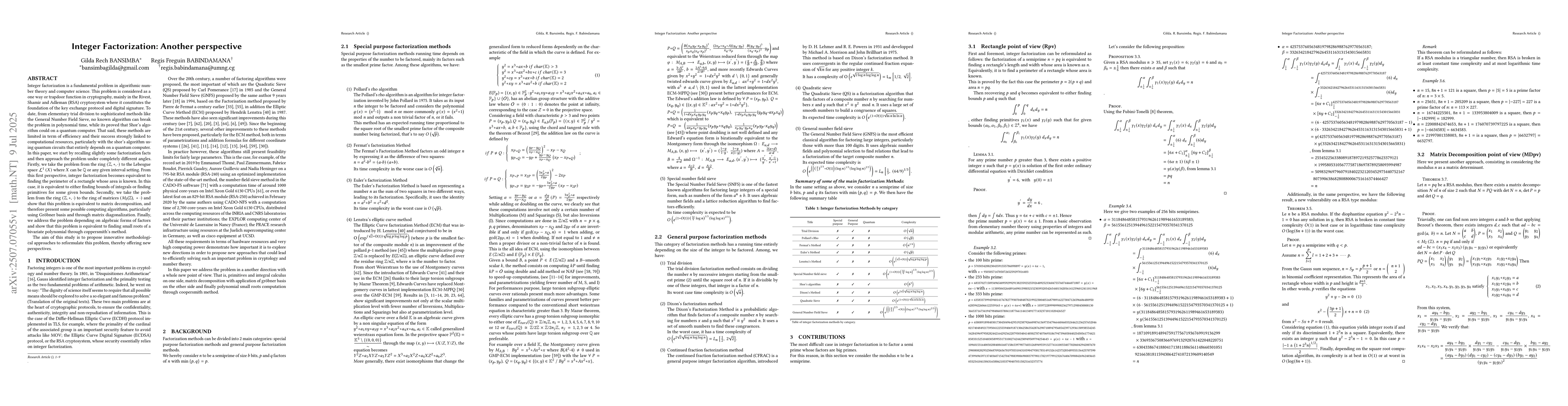 Integer factorization is a fundamental problem in algorithmic number theory and computer science. It is considered as a one way or trapdoor function in the (RSA) cryptosystem. To date, from elementary trial division to sophisticated methods like the General Number Field Sieve, no known algorithm can break the problem in polynomial time, while its proved that Shor's algorithm could on a quantum computer. In this paper, we recall some factorization algorithms and then approach the problem under different angles. Firstly, we take the problem from the ring $\displaystyle\left(\mathbb{Z}, \text{+}, \cdot\right)$ to the Lebesgue space $\mathcal{L}^{1}\left(X\right)$ where $X$ can be $\mathbb{Q}$ or any given interval setting. From this first perspective, integer factorization becomes equivalent to finding the perimeter of a rectangle whose area is known. In this case, it is equivalent to either finding bounds of integrals or finding primitives for some given bounds. Secondly, we take the problem from the ring $\displaystyle\left(\mathbb{Z}, \text{+}, \cdot\right) $ to the ring of matrices $\left( M_{2}\text{(}\mathbb{Z}\text{)}, \ \text{+} \ \cdot\right)$ and show that this problem is equivalent to matrix decomposition, and therefore present some possible computing algorithms, particularly using Gr\"obner basis and through matrix diagonalization. Finally, we address the problem depending on algebraic forms of factors and show that this problem is equivalent to finding small roots of a bivariate polynomial through coppersmith's method. The aim of this study is to propose innovative methodological approaches to reformulate this problem, thereby offering new perspectives.