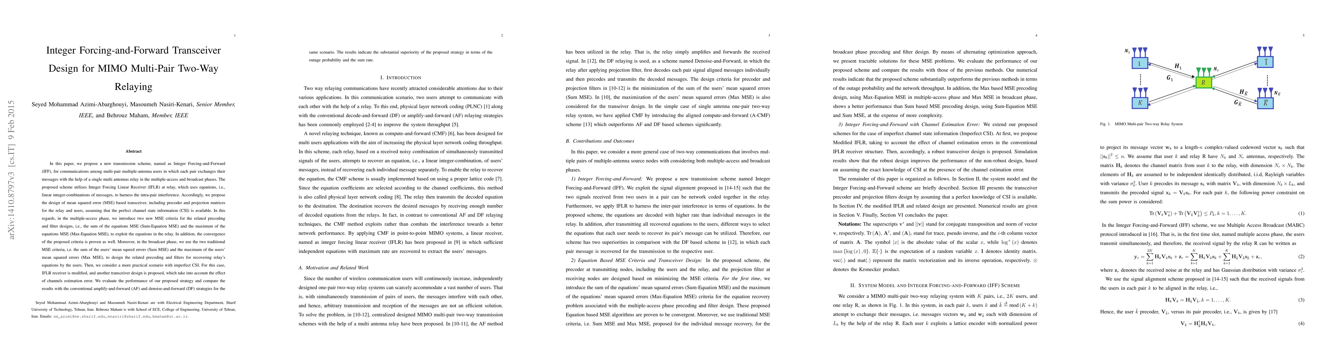 In this paper, we propose a new transmission scheme, named as Integer Forcing-and-Forward (IFF), for communications among multi-pair multiple-antenna users in which each pair exchanges their messages with the help of a single multi antennas relay in the multiple-access and broadcast phases. The proposed scheme utilizes Integer Forcing Linear Receiver (IFLR) at relay, which uses equations, i.e., linear integer-combinations of messages, to harness the intra-pair interference. Accordingly, we propose the design of mean squared error (MSE) based transceiver, including precoder and projection matrices for the relay and users, assuming that the perfect channel state information (CSI) is available. In this regards, in the multiple-access phase, we introduce two new MSE criteria for the related precoding and filter designs, i.e., the sum of the equations MSE (Sum-Equation MSE) and the maximum of the equations MSE (Max-Equation MSE), to exploit the equations in the relay. In addition, the convergence of the proposed criteria is proven as well. Moreover, in the broadcast phase, we use the two traditional MSE criteria, i.e. the sum of the users' mean squred errors (Sum MSE) and the maximum of the users' mean squared errors (Max MSE), to design the related precoding and filters for recovering relay's equations by the users. Then, we consider a more practical scenario with imperfect CSI. For this case, IFLR receiver is modified, and another transceiver design is proposed, which take into account the effect of channels estimation error. We evaluate the performance of our proposed strategy and compare the results with the conventional amplify-and-forward (AF) and denoise-and-forward (DF) strategies for the same scenario. The results indicate the substantial superiority of the proposed strategy in terms of the outage probability and the sum rate.