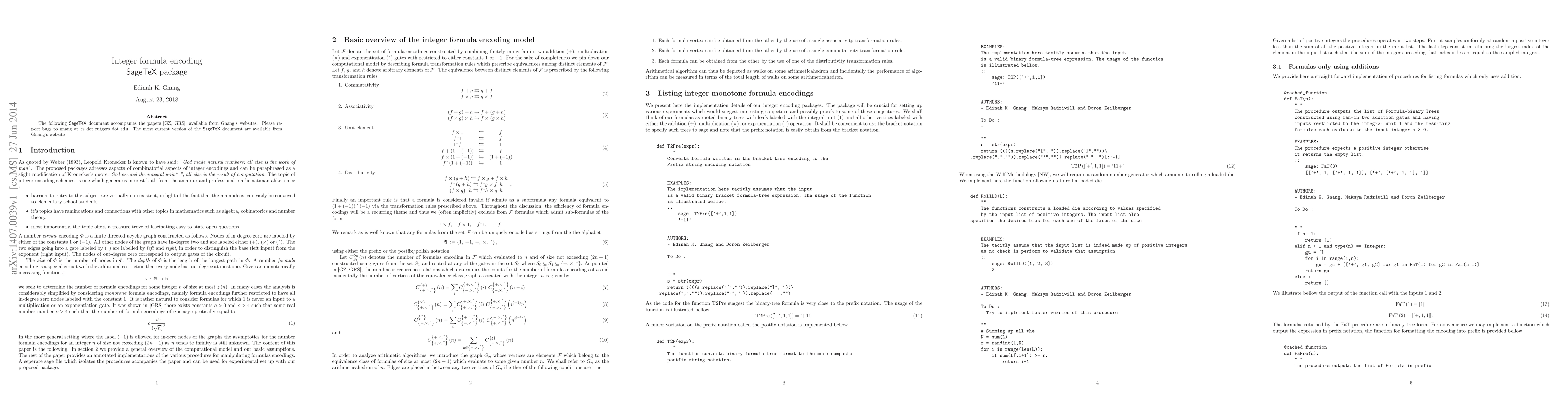 Summary: This paper presents a SageTeX package that implements integer encoding procedures, enhancing the integration of Sage mathematical computations within LaTeX documents. The package aims to simplify the process of encoding integers using Sage's computational capabilities.