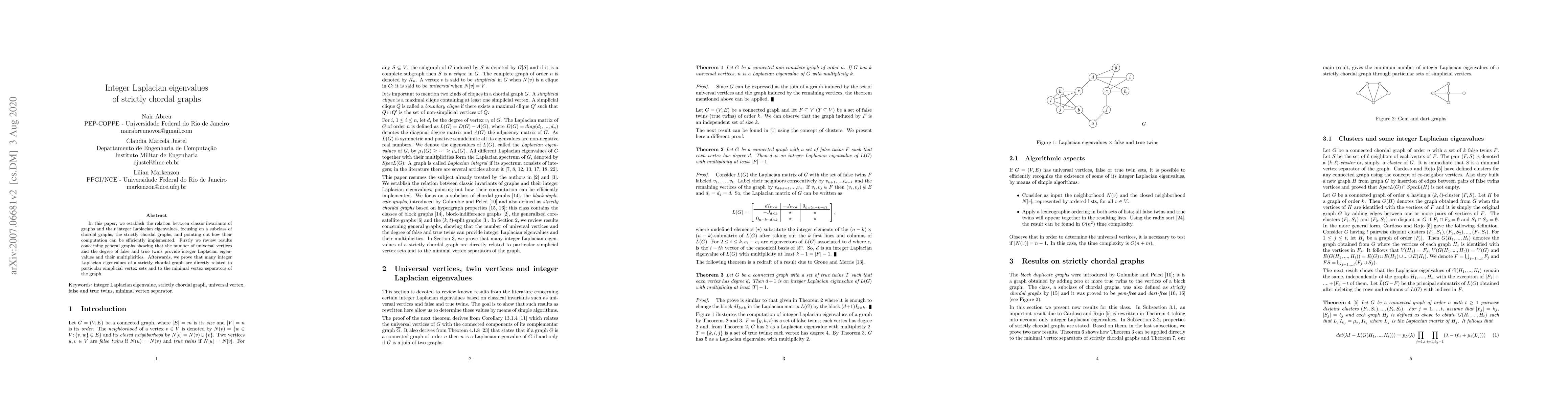 This paper explores the relationship between graph invariants and integer Laplacian eigenvalues, specifically for strictly chordal graphs. It demonstrates that these eigenvalues are linked to simplicial vertex sets and minimal vertex separators, providing a method for efficient computation.