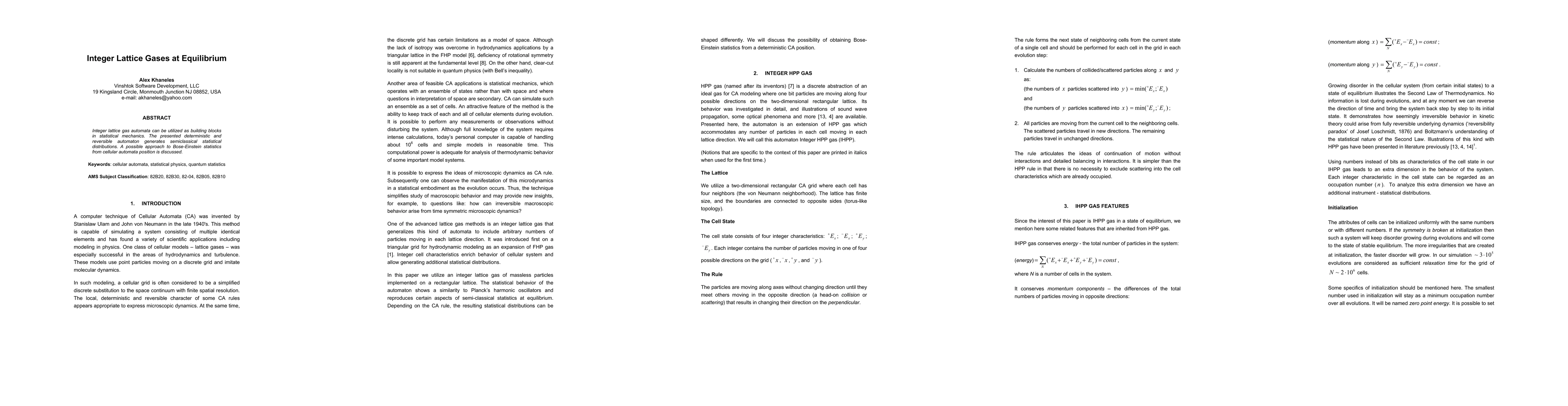 Integer lattice gas automata can be utilized as building blocks in statistical mechanics. The presented deterministic and reversible automaton generates semiclassical statistical distributions. A possible approach to Bose-Einstein statistics from cellular automata position is discussed.