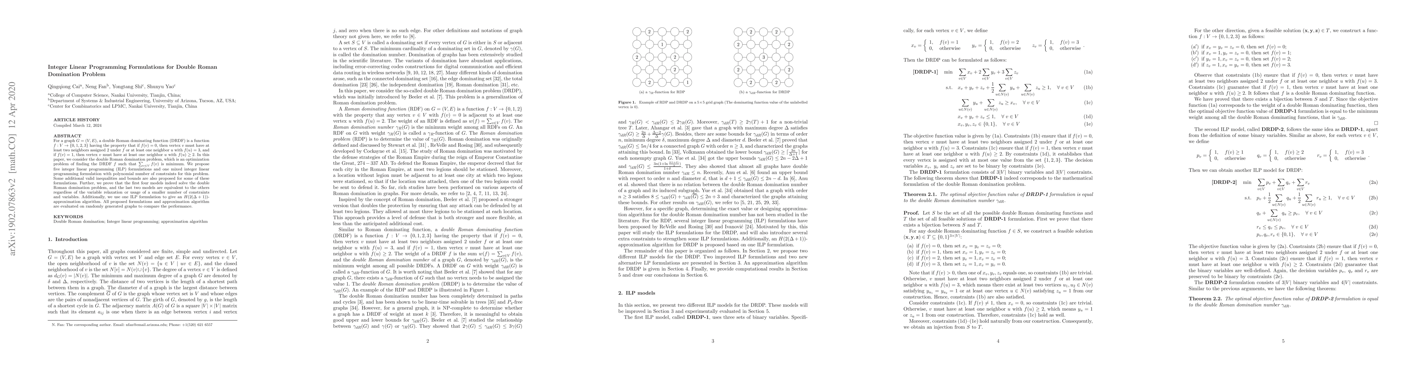 This paper proposes integer linear programming formulations for the double Roman domination problem, aiming to minimize the sum of a function $f: V \to \{0,1,2,3\}$ on a graph. It presents five ILP formulations and one mixed ILP, proving that the first four solve the problem optimally while the last two are equivalent, and evaluates their performance on random graphs.
