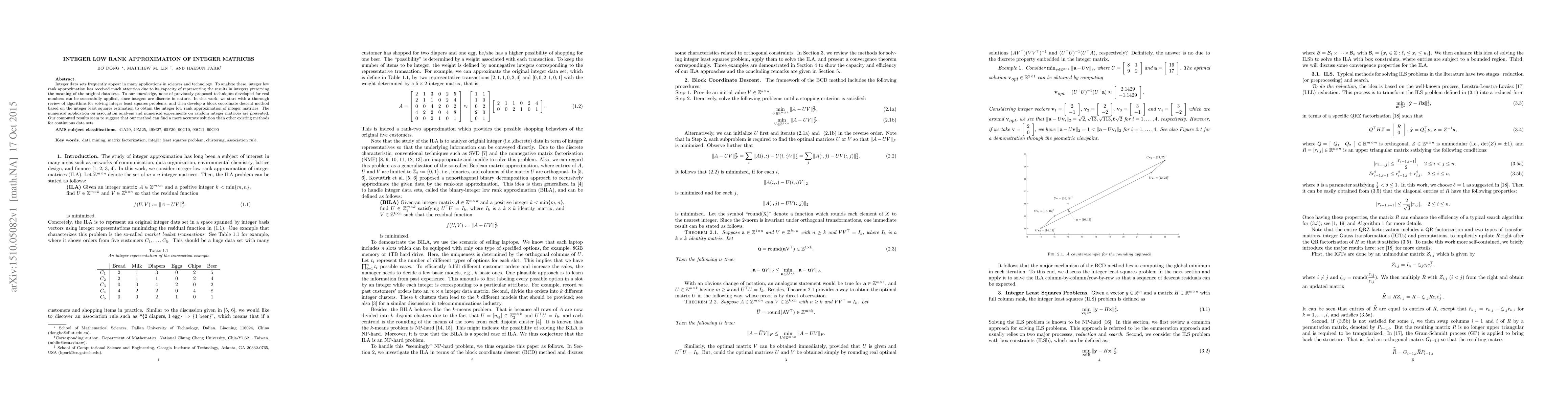This paper develops a novel block coordinate descent method for integer low rank approximation of integer matrices, focusing on preserving the integer nature of data. The proposed method is shown to outperform existing techniques for continuous data sets in numerical experiments and applications in association analysis.