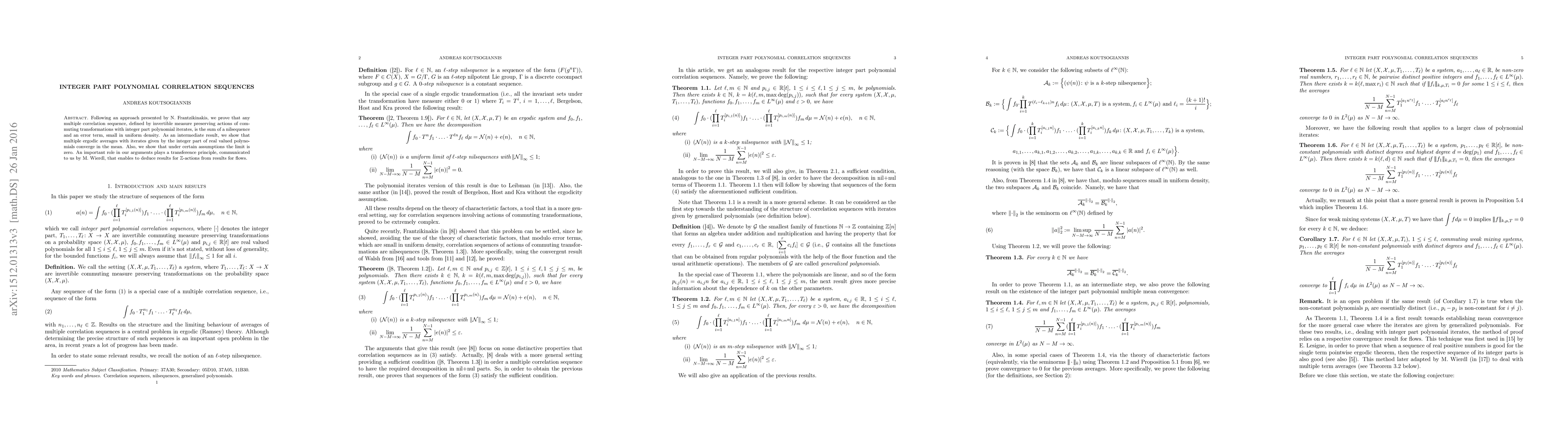 This paper proves that multiple correlation sequences arising from commuting transformations with integer part polynomial iterates are the sum of a nilsequence and a small error term, leveraging a transference principle to deduce results for $\mathbb{Z}$-actions from flow results. It also shows that multiple ergodic averages with such iterates converge in the mean, with the limit being zero under certain assumptions.